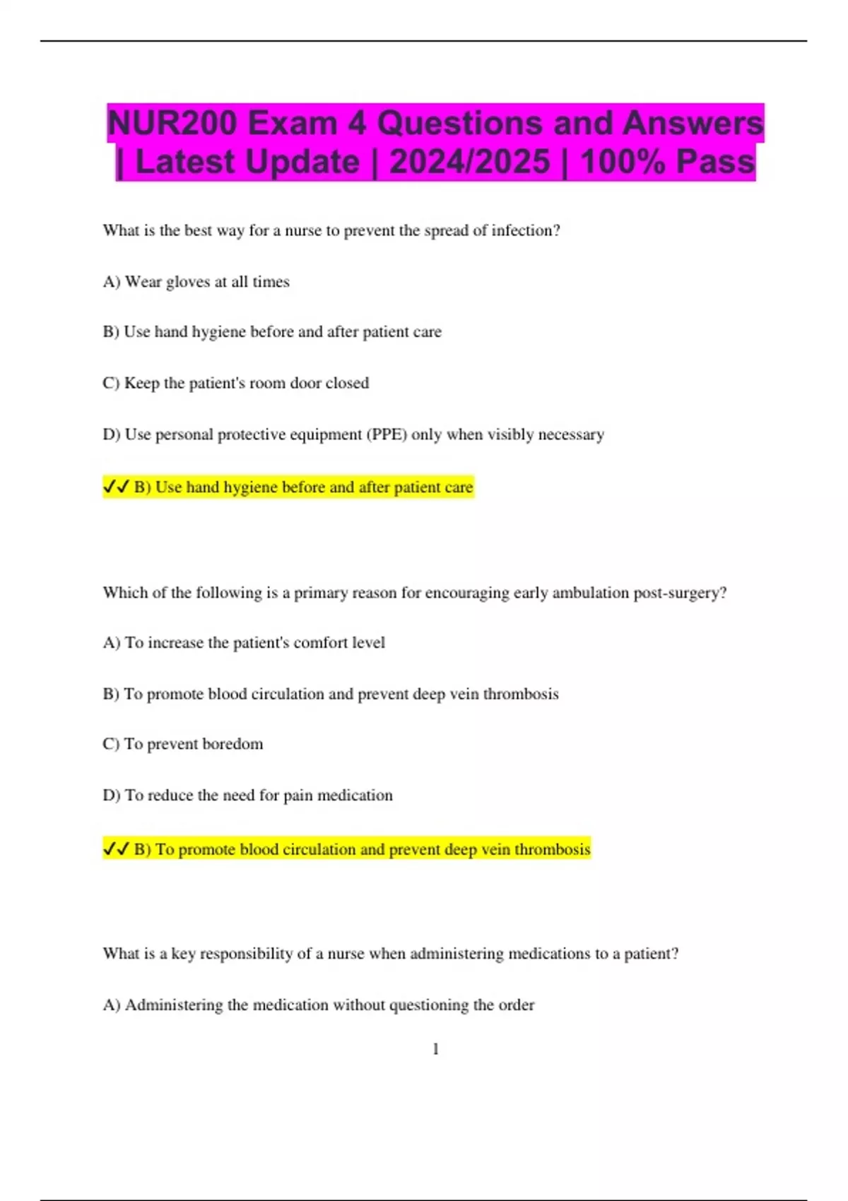 NUR200 Exam 4 Questions and Answers | Latest Update | 2024/2025 | 100% Pass What is the best way for a nurse to prevent the spread of infection? A) Wear gloves at all times B) Use hand hygiene before and after patient care C) Keep the patient's room door closed D) Use personal protective equipment (PPE) only when visibly necessary B) Use hand hygiene before and after patient care Which of the following is a primary reason for encouraging early ambulation post-surgery? A) To increase the patient's comfort level B) To promote blood circulation and prevent deep vein thrombosis C) To prevent boredom D) To reduce the need for pain medication B) To promote blood circulation and prevent deep vein thrombosis What is a key responsibility of a nurse when administering medications to a patient? A) Administering the medication without questioning the order 2 B) Double-checking the five rights of medication administration C) Relying solely on memory to confirm the patient’s dosage D) Administering medications based on the patient’s request B) Double-checking the five rights of medication administration Which of the following should a nurse prioritize when caring for a patient in pain? A) Administer pain medication every four hours regardless of the patient’s request B) Use both pharmacologic and non-pharmacologic methods of pain management C) Ignore patient pain complaints if their vital signs are normal D) Wait until the physician confirms the patient's pain before taking action B) Use both pharmacologic and non-pharmacologic methods of pain management What is the purpose of a care plan in nursing? A) To provide legal protection for the nurse B) To outline standardized steps for all patients C) To offer individualized care that addresses the patient’s specific needs D) To make documentation easier for nurses C) To offer individualized care that addresses the patient’s specific needs 3 How can a nurse best evaluate the effectiveness of an intervention? A) Assume it’s effective if no complaints are heard B) Continuously assess the patient’s progress and adjust the intervention as needed C) Ask the physician for feedback D) Wait until discharge to assess the outcome B) Continuously assess the patient’s progress and adjust the intervention as needed Which vital sign change is most concerning for a nurse when assessing a post-operative patient? A) Slight increase in heart rate B) A drop in blood pressure below the patient’s baseline C) A slight increase in temperature D) A decrease in respiratory rate B) A drop in blood pressure below