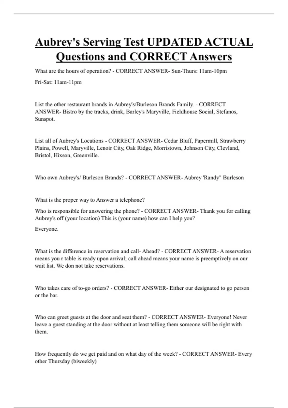 Aubrey's Serving Test UPDATED ACTUAL Questions and CORRECT Answers What are the hours of operation? - CORRECT ANSWER- Sun-Thurs: 11am-10pm Fri-Sat: 11am-11pm List the other restaurant brands in Aubrey's/Burleson Brands Family. - CORRECT ANSWER- Bistro by the tracks, drink, Barley's Maryville, Fieldhouse Social, Stefanos, Sunspot. List all of Aubrey's Locations - CORRECT ANSWER- Cedar Bluff, Papermill, Strawberry Plains, Powell, Maryville, Lenoir City, Oak Ridge, Morristown, Johnson City, Clevland, Bristol, Hixson, Greenville