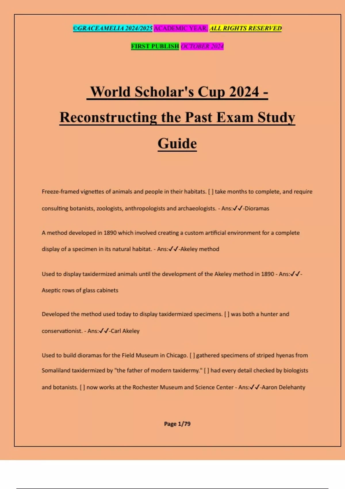 World Scholar's Cup 2024 - Reconstructing the Past Exam Study Guide Freeze-framed vignettes of animals and people in their habitats. [ ] take months to complete, and require consulting botanists, zoologists, anthropologists and archaeologists. - Ans:-Dioramas A method developed in 1890 which involved creating a custom artificial environment for a complete display of a specimen in its natural habitat. - Ans:-Akeley method Used to display taxidermized animals until the development of the Akeley method in 1890 - Ans:- Aseptic rows of glass cabinets Developed the method used today to display taxidermized specimens. [ ] was both a hunter and conservationist. - Ans:-Carl Akeley Used to build dioramas for the Field Museum in Chicago. [ ] gathered specimens of striped hyenas from Somaliland taxidermized by "the father of modern taxidermy." [ ] had every detail checked by biologists and botanists. [ ] now works at the Rochester Museum and Science Center - Ans:-Aaron Delehanty ©GRACEAMELIA 2024/2025 ACADEMIC YEAR. ALL RIGHTS RESERVED FIRST PUBLISH OCTOBER 2024 Page 2/79 An open-air history museum in Barcelona built originally for the 1929 World's Fair. [ ] is designed like an Iberian village with small streets, a monastery, and a town hall, and covers approximately 50,000 square meters in area. [ ] was meant to be demolished after the fair, but it became so popular that the populace successfully prevented its destruction. Tourists can watch craftsmen and glassblowers perform their traditional work. - Ans:-Poble Espanyol An architect who, with an art critic, his students, and a painter, made notes and plans for an open-air museum for the 1929 World Fair in Barcelona. - Ans:-Puig i Cadafalch Located in Calgary, it is the largest living history museum in Canada. It displays the lifestyle of settlers in the late 19th and early 20th centuries. - Ans:-Heritage Park A free admission section of the largest living history museum in Canada. - Ans:-Heritage Park Square A historical cultural theme park in Kaifeng on the western shore of Longting Lake and along the Bianhe river. It brings to life the culture of the Northern Song dynasty, depicted originally by artist Zhang Zeduan . [ ] features an imperial tree garden, a flat bluestone passage, and many pavillions - Ans:-Millennium City Park An artist from the Northern Song Dynasty who painted the Millennium City Park, which was used as the reference for the creation of the cultural theme park in Kaifeng. - Ans:-Zhang Zeduan A park in Disneyland originally themed around depicting the American frontiers like the "Wild West era" of the midwest in the 18th and 19th centuries. It has evolved to include more of Mexican culture in its ©GRACEAMELIA 2024/2025 ACADEMIC YEAR. ALL RIGHTS RESERVED FIRST PUBLISH OCTOBER 2024 Page 3/79 many shops, and attractions. It has two boats, which are depictions of a smaller ferry, and a larger more dedicated travel ship - Ans:-Frontierland Named after the pen name of Samuel Langhorne Clemens, it is a replica of the smaller vessels that would ferry settlers up and down the Mississippi and Missouri Rivers found in Frontierland. - Ans:- Mark Twain Riverboat A replica found in Frontierland of the first ship to circumnavigate the globe. - Ans:-Columbia Sailing Ship An attraction found in Frontierland of an attempt to replicate the lair of outlaws Tom Sawyer and Huck Finn. - Ans:-Pirate's Lair on Tom Sawyer Island The original name for a living history museum found in Plymouth, Massachu