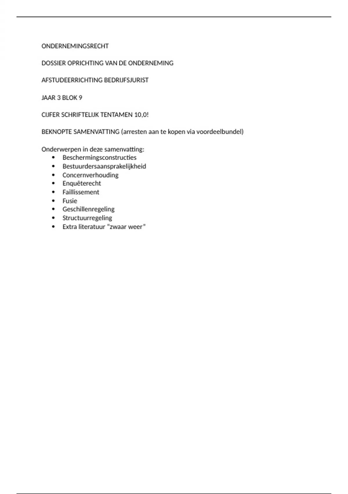 Samenvatting van alle onderwerpen bij het vak - Oprichting van de onderneming (1415BJ311A) Voor mijn schriftelijk tentamen had ik het cijfer 10,0! De samenvatting is heel beknopt en gaat alleen in op de kern van het tentamen. Arresten zijn te verkrijgen in apart document of voordeelbundel.