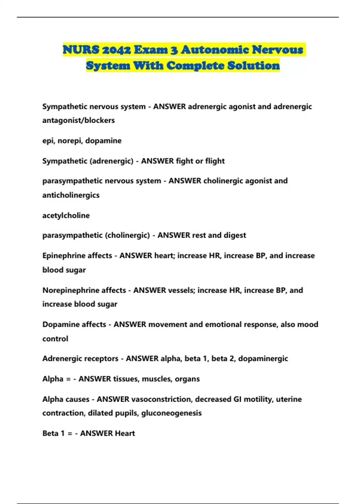 NURS 2042 Exam 3 Autonomic Nervous