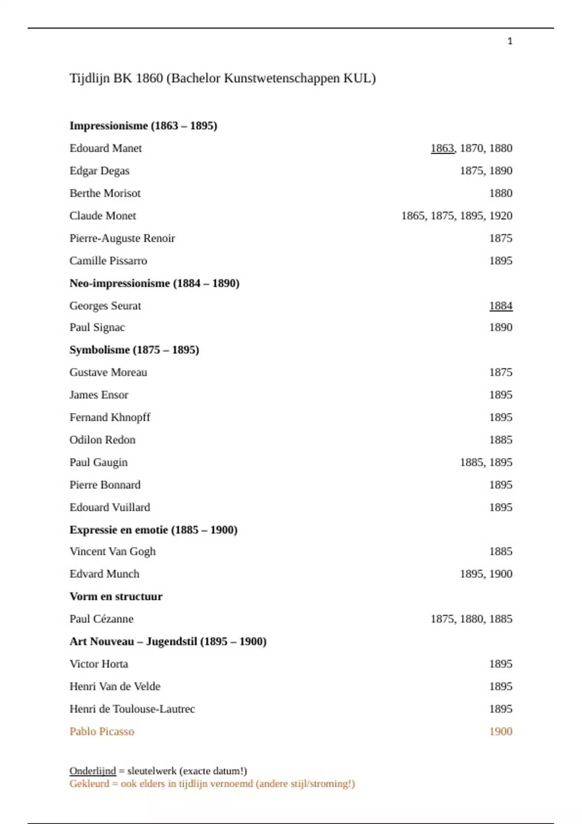 Alle data van kunstwerken die tijdens de lessen aan bod zijn gekomen ( en gekend moeten worden) zijn hier per kunstenaar samengevat. Je kan dit document ook goed gebruiken om een overzicht te verkrijgen over de vele kunstenaars en stromingen. Voor de evaluatie moeten de werken met een marge van 5 jaar gekend zijn, tenzij anders aangegeven zoals in het document.