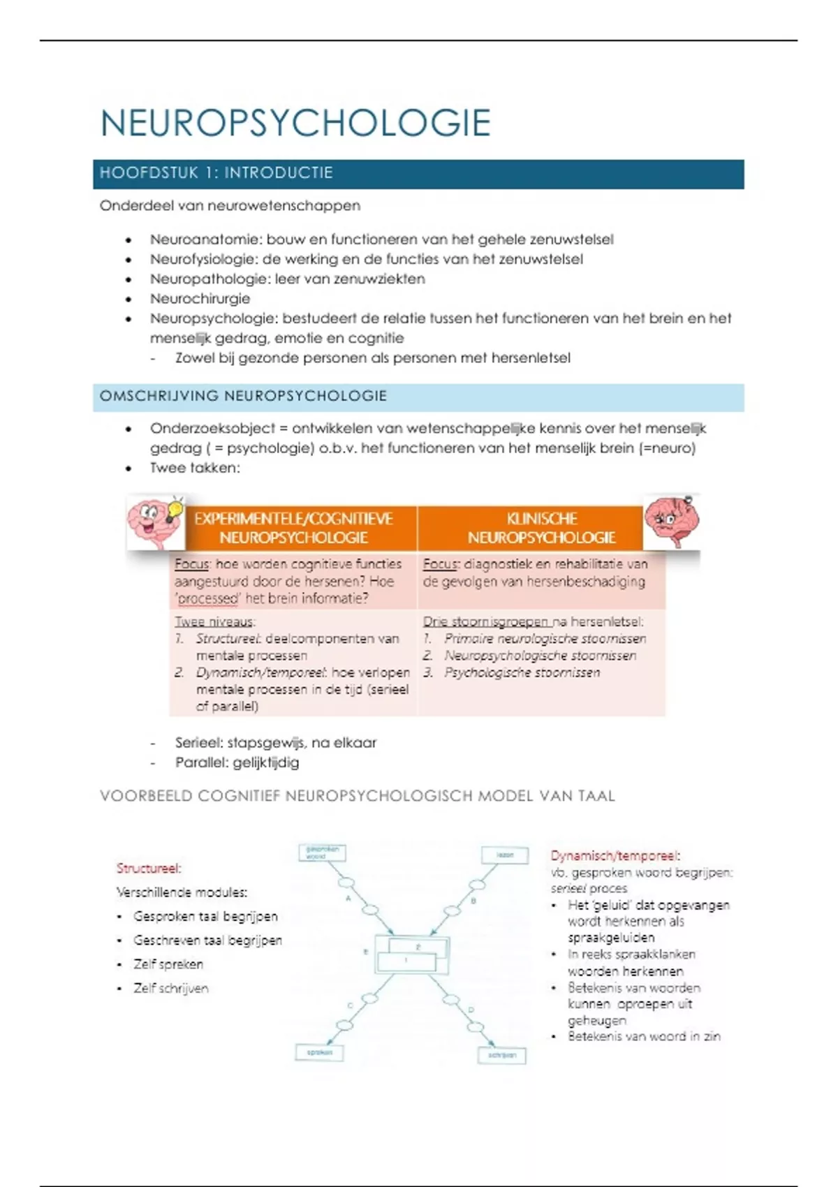 Deze samenvatting is van het vak neuropsychologie. Gegeven door docenten Mieke Samyn en Isabel Vandemaele in het tweede jaar Toegepaste psychologie te Vives Kortrijk. De samenvatting is volledig en is gebaseerd op zowel de lessen, cursus als de ppt's. Het bevat ook verschillende illustraties, tabellen, ... om het leren aangenamer en efficiënter te maken. Veel succes!