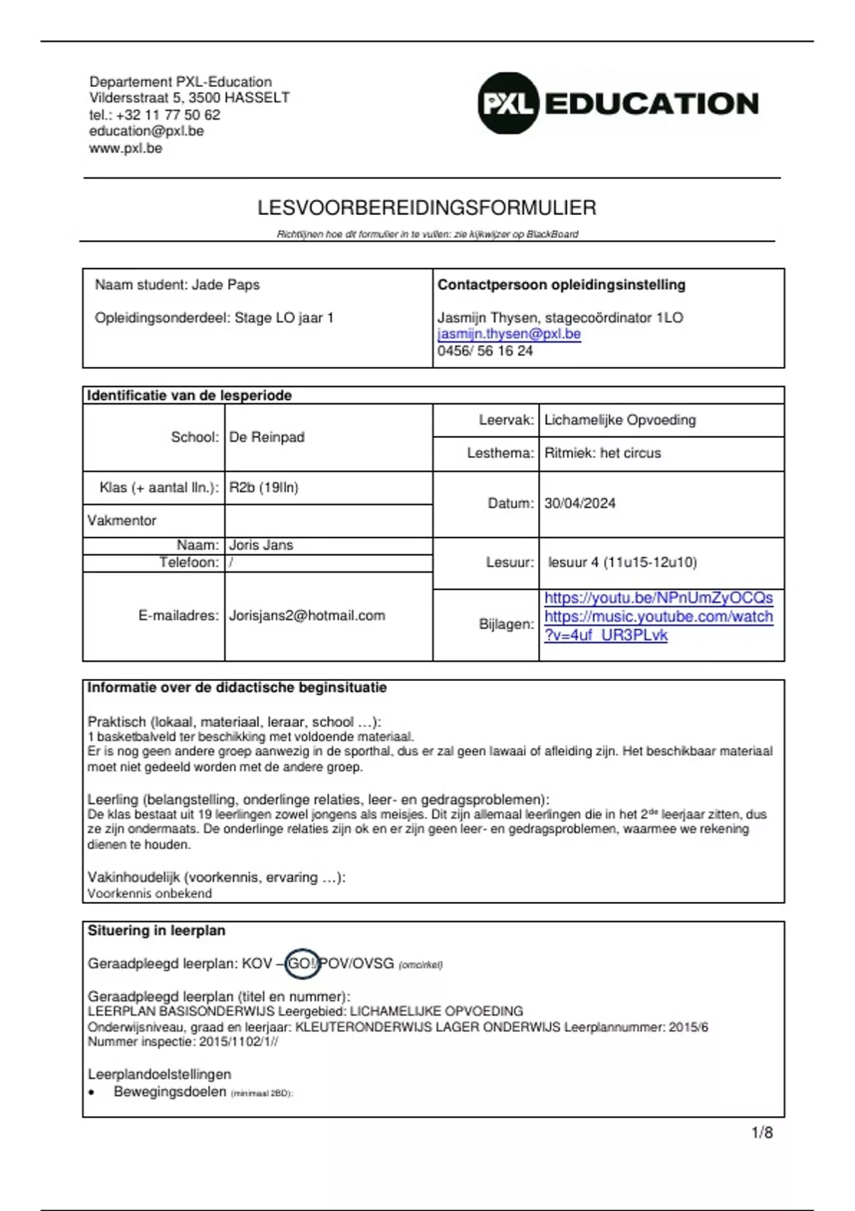 Opleidingsonderdeel: Stage LO jaar 1 Jasmijn Thysen, stagecoördinator 1LO
