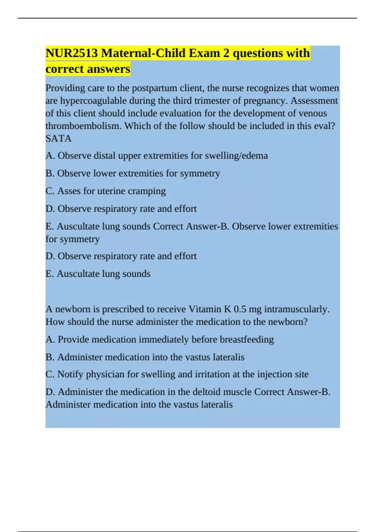 E. Auscultate lung sounds Correct Answer-B. Observe lower extremities