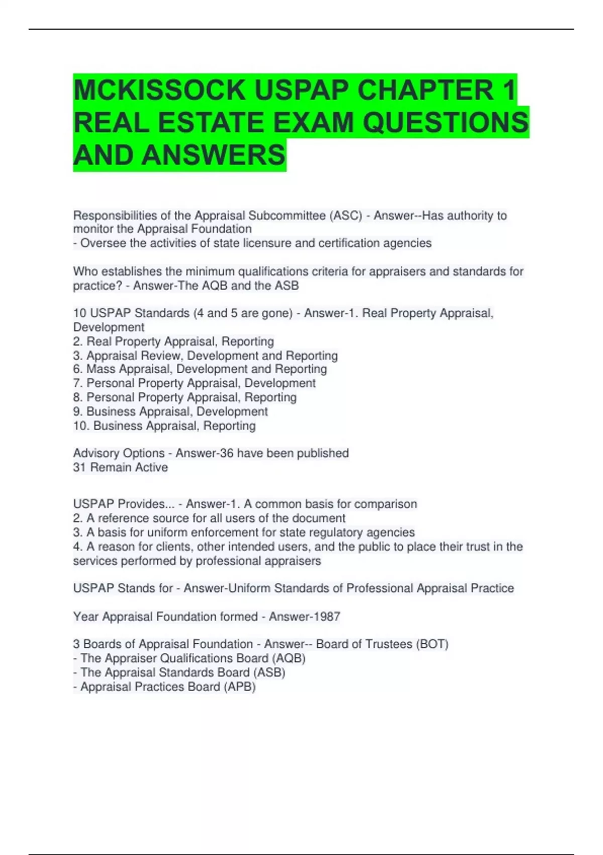 MCKISSOCK USPAP CHAPTER 1 REAL ESTATE EXAM QUESTIONS AND ANSWERS Responsibilities of the Appraisal Subcommittee (ASC) - Answer--Has authority to monitor the Appraisal Foundation - Oversee the activities of state licensure and certification agencies Who establishes the minimum qualifications criteria for appraisers and standards for practice? - Answer-The AQB and the ASB 10 USPAP Standards (4 and 5 are gone) - Answer-1. Real Property Appraisal, Development 2. Real Property Appraisal, Reporting 3. Appraisal Review, Development and Reporting 6. Mass Appraisal, Development and Reporting 7. Personal Property Appraisal, Development 8. Personal Property Appraisal, Reporting 9. Business Appraisal, Development 10. Business Appraisal, Reporting Advisory Options - Answer-36 have been published 31 Remain Active USPAP Provides... - Answer-1. A common basis for comparison 2. A reference source for all users of the document 3. A basis for uniform enforcement for state regulatory agencies 4. A reason for clients, other intended users, and the public to place their trust in the services performed by professional appraisers USPAP Stands for - Answer-Uniform Standards of Professional Appraisal Practice Year Appraisal Foundation formed - Answer-1987 3 Boards of Appraisal Foundation - Answer-- Board of Trustees (BOT) - The Appraiser Qualifications Board (AQB) - The Appraisal Standards Board (ASB) - Appraisal Practices Board (APB)