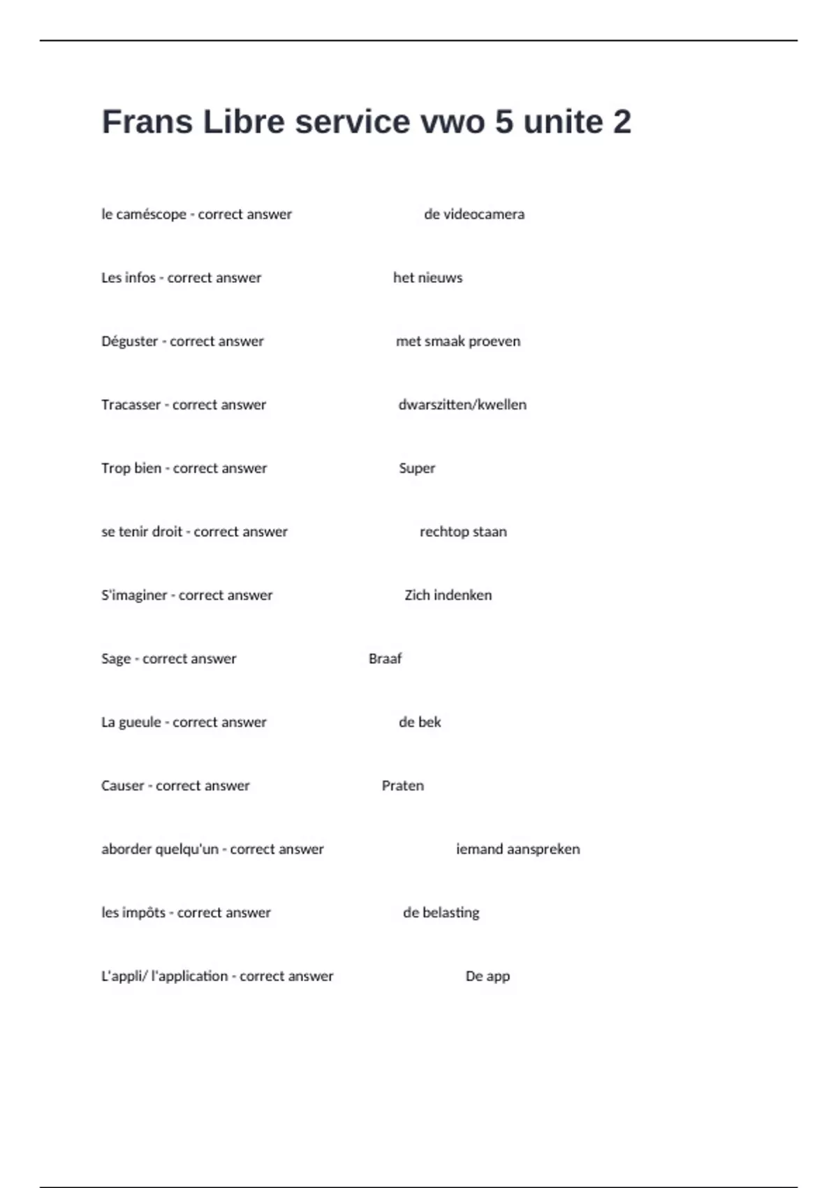 le caméscope - correct answer de videocamera Les infos - correct answer het nieuws Déguster - correct answer met smaak proeven Tracasser - correct answer dwarszitten/kwellen Trop bien - correct answer Super se tenir droit - correct answer rechtop staan S'imaginer - correct answer Zich indenken Sage - correct answer Braaf La gueule - correct answer de bek Causer - correct answer Praten aborder quelqu'un - correct answer iemand aanspreken les impôts - correct answer de belasting L'appli/ l'application - correct answer De app S'entraîner - correct answer Trainen Se faire - correct answer Zwijgen interrompre - correct answer Iemand in de rede vallen Être silencieux - correct answer Stil/zwijgzaam Être muet - correct answer Niets zeggen Être bavard - correct answer Spraakzaam zijn Prentte la parole - correct answer Het woord nemen contredire - correct answer tegenspreken consécutif - correct answer achtereenvolgend Réussir - correct answer slagen La paresse - correct answer de luiheid fournir - correct answer leveren la conviction - correct answer de overtuiging accessible - correct answer Toegankelijk Désigner - correct answer aanwijzen L'avenir - correct answer De toekomst estimer - correct answer menen la perception - correct answer de waarneming inférieur - correct answer lager dan mentionner - correct answer noemen vain - correct answer Vergeefs L'étude - correct answer Het onderzoek/ de studie juger - correct answer beoordelen D'après - correct answer Volgens Le regard - correct answer de blik la confiance - correct answer Het vertrouwen À propos de - correct answer Met betrekking tot traiter - correct answer behandelen le domaine - correct answer het gebied vaste - correct answer uitgebreid la moyenne - correct answer het gemiddelde Se tenir bien dans sa peau - correct answer Goed in je vel zitten fixer des objectifs - correct answer doelen stellen la confiance en soi - correct answer het zelfvertrouwen le courage - correct answer de moed le bonheur - correct answer het geluk la réussite - correct answer het succes le portable - correct answer De mobiel Éteint - correct answer Uit/ uitgezet le vol - correct answer De diefstal soupçonner - correct answer verdenken accuser - correct answer beschuldigen le fric - correct answer het geld se méfier de - correct answer Wantrouwen manquer - correct answer Ontbreken/ missen J'ai beau - correct answer Ik kan wat ik wil S'inquiéter - correct answer Zich zorgen maken La caisse - correct answer de kassa