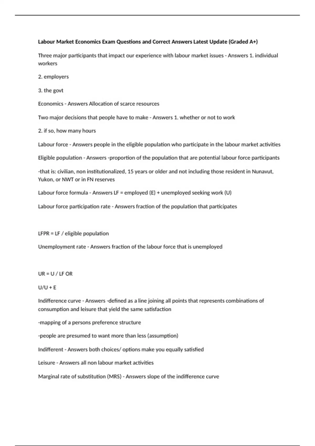 Labour force formula - Answers LF = employed (E) + unemployed seeking work (U)