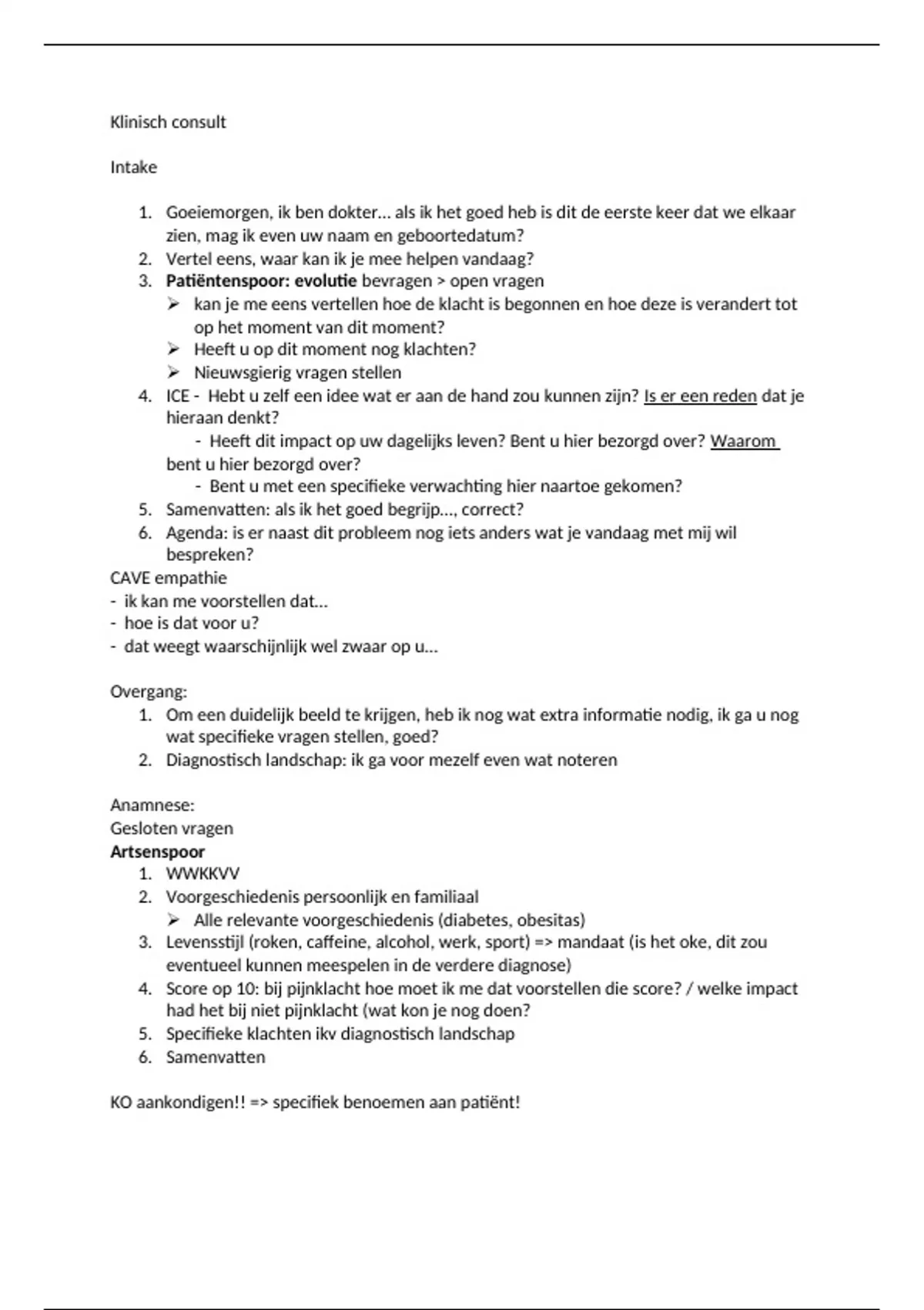 samenvatting klinisch consult: volgorde consult intake, anamnese, uitleg advies planning alles waar punten op staan