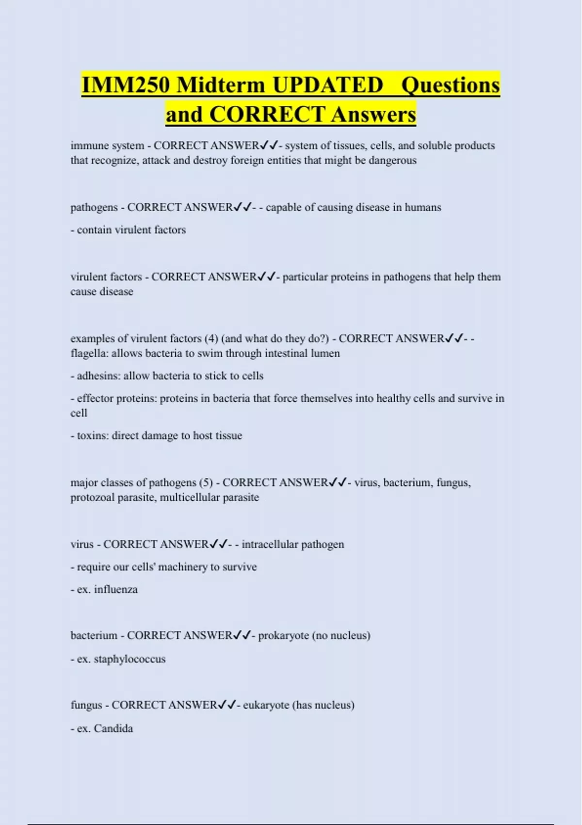 major classes of pathogens (5) - CORRECT ANSWER✔✔- virus, bacterium, fungus,