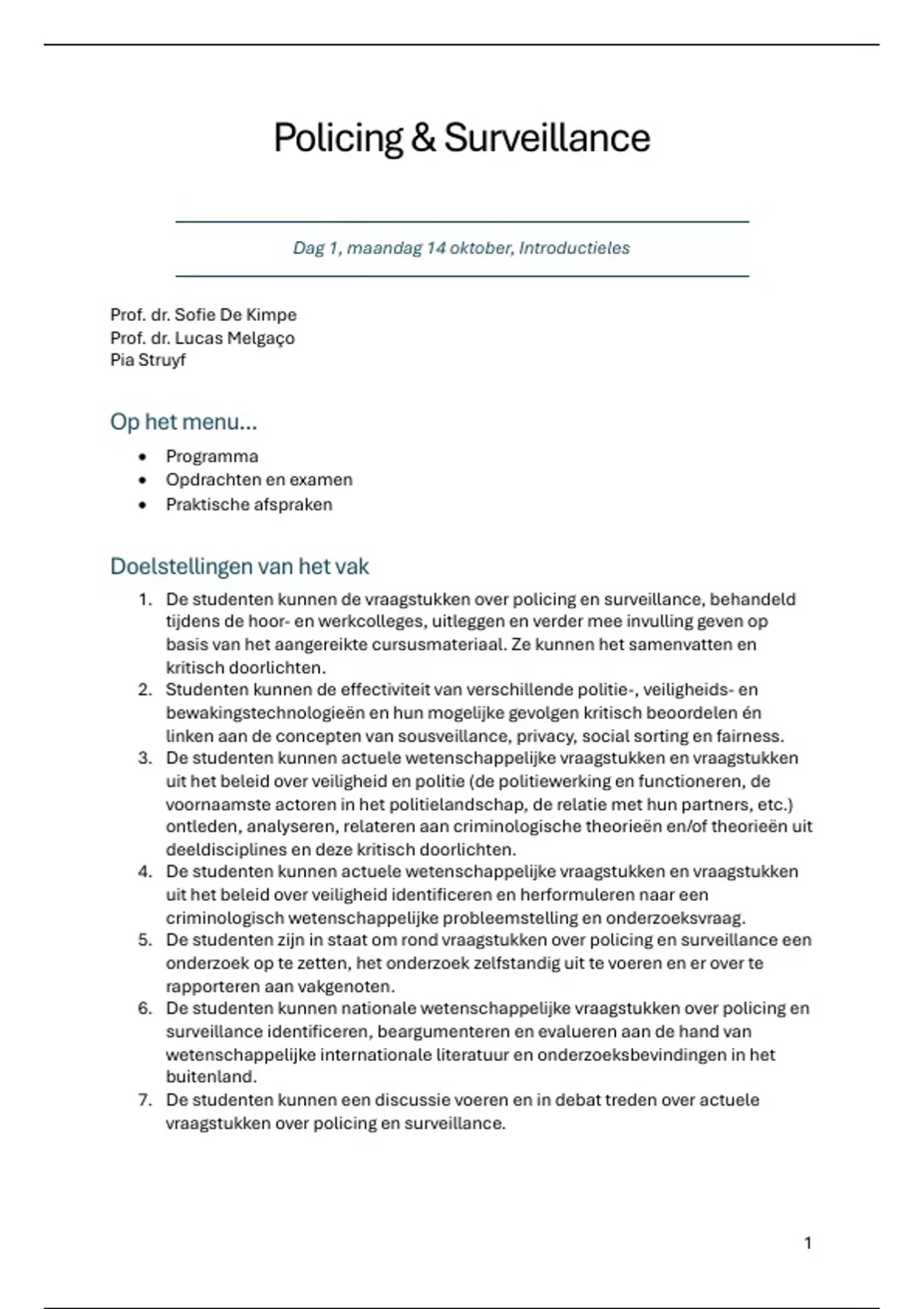1. De studenten kunnen de vraagstukken over policing en surveillance, behandeld