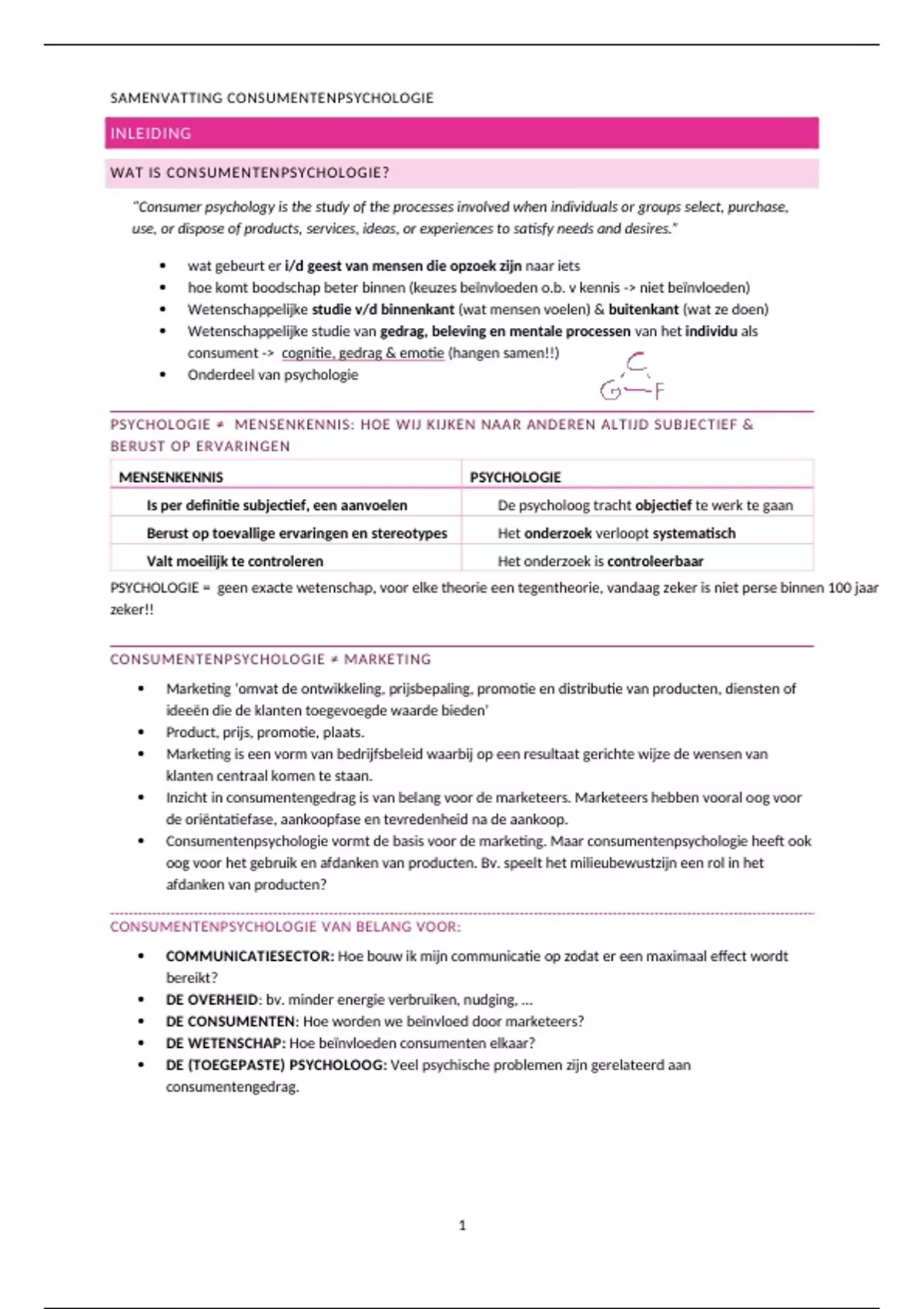 SAMENVATTING CONSUMENTENPSYCHOLOGIE