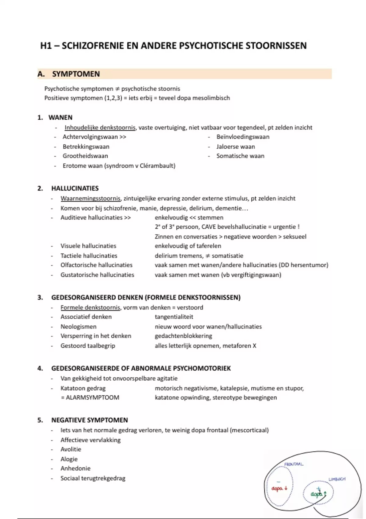 Positieve symptomen (1,2,3) = iets erbij = teveel dopa mesolimbisch