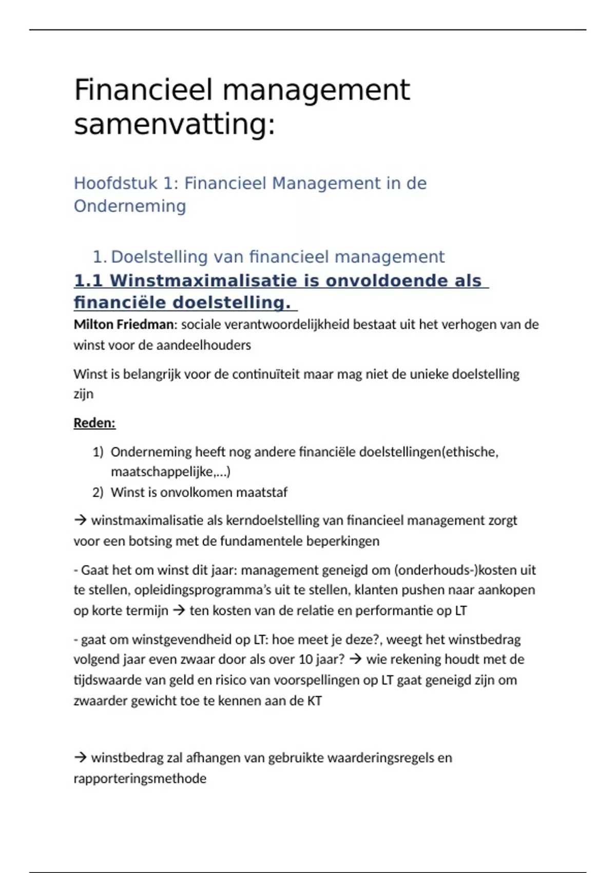 Samenvatting van Financieel Management van de KU Leuven in Antwerpen, gegeven door Eugeen Dieltjes.