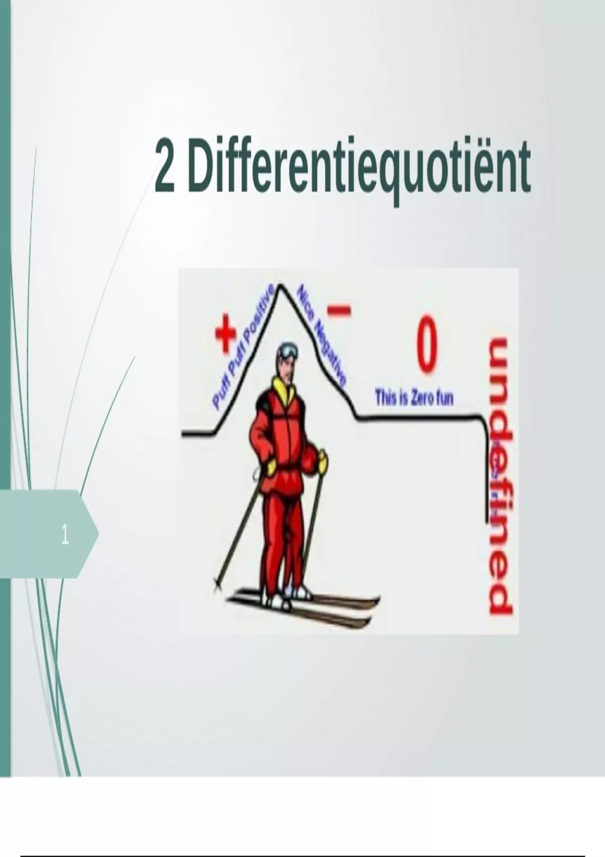 Ontdek de Kracht van Verandering: Het Differentiequotiënt Heb je je ooit afgevraagd hoe je precies kunt meten hoe snel iets toeneemt of afneemt, zoals de temperatuur gedurende de dag of de snelheid van een auto? Met het differentiequotiënt duiken we in de wiskundige magie achter verandering. In dit hoofdstuk leer je: Hoe grafieken het verhaal van stijgen en dalen vertellen. Wat een richtingscoëfficiënt is en waarom het de sleutel is tot lineaire verandering. Hoe je de gemiddelde verandering van een functie berekent met het differentiequotiënt.