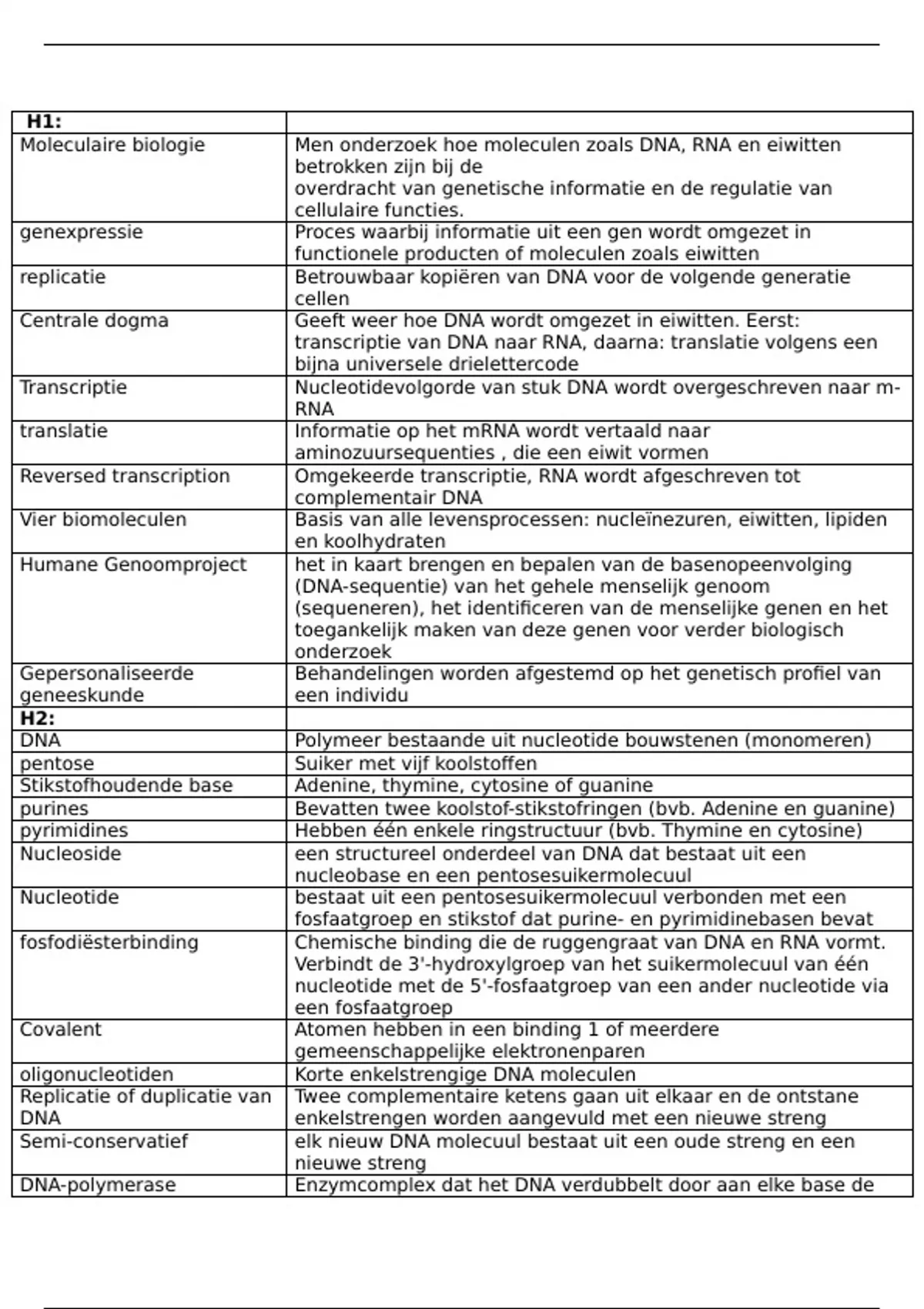 Dit is een begrippenlijst van het vak BLT14 Moleculaire Biologie waarbij alle begrippen en woorden die moeten gekend worden voor het examen. Deze lijst is ook verbeterd door de lector (Rita Verhelst). Alle woorden van Hoofdstuk 1 tem hoofdstuk 15 zijn uitgewerkt.
