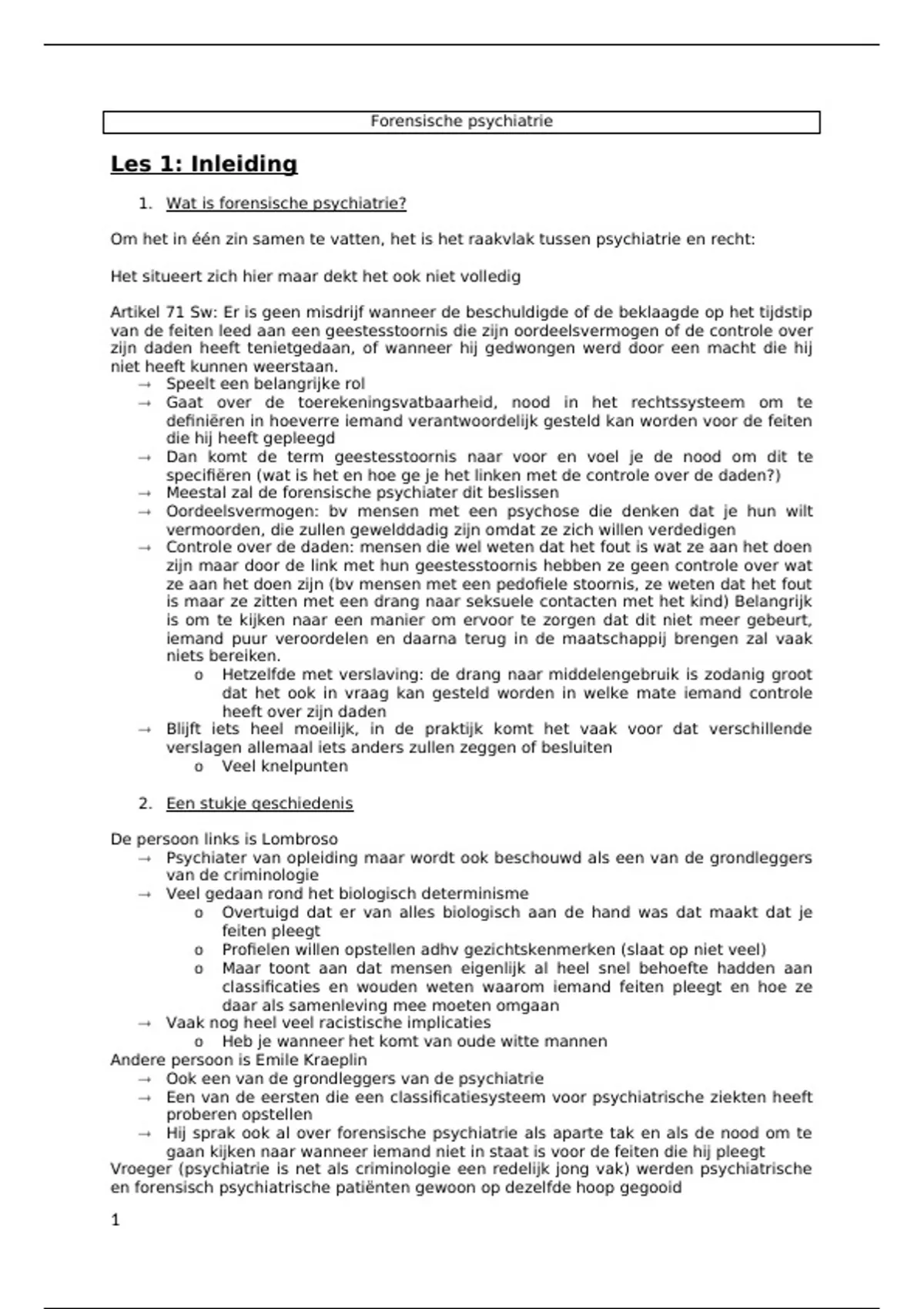 Dit zijn de lesnota's van forensische psychiatrie gedoceerd door professor Wuyts (academiejaar 24-25 ). Alle lessen zijn uitgetypt in combinatie met de slides. Voor de rechtenstudenten is dit een keuzevak in de master rechten.