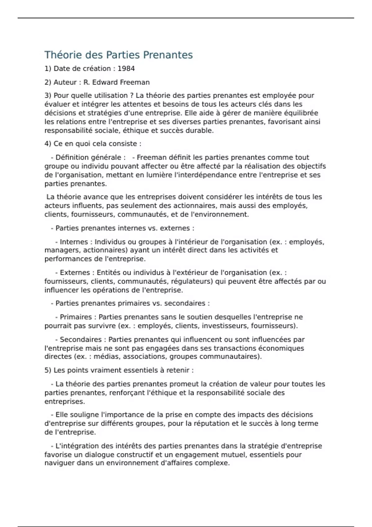Résumé Mana Année 1 Question 1.3 Théorie des Parties Prenantes