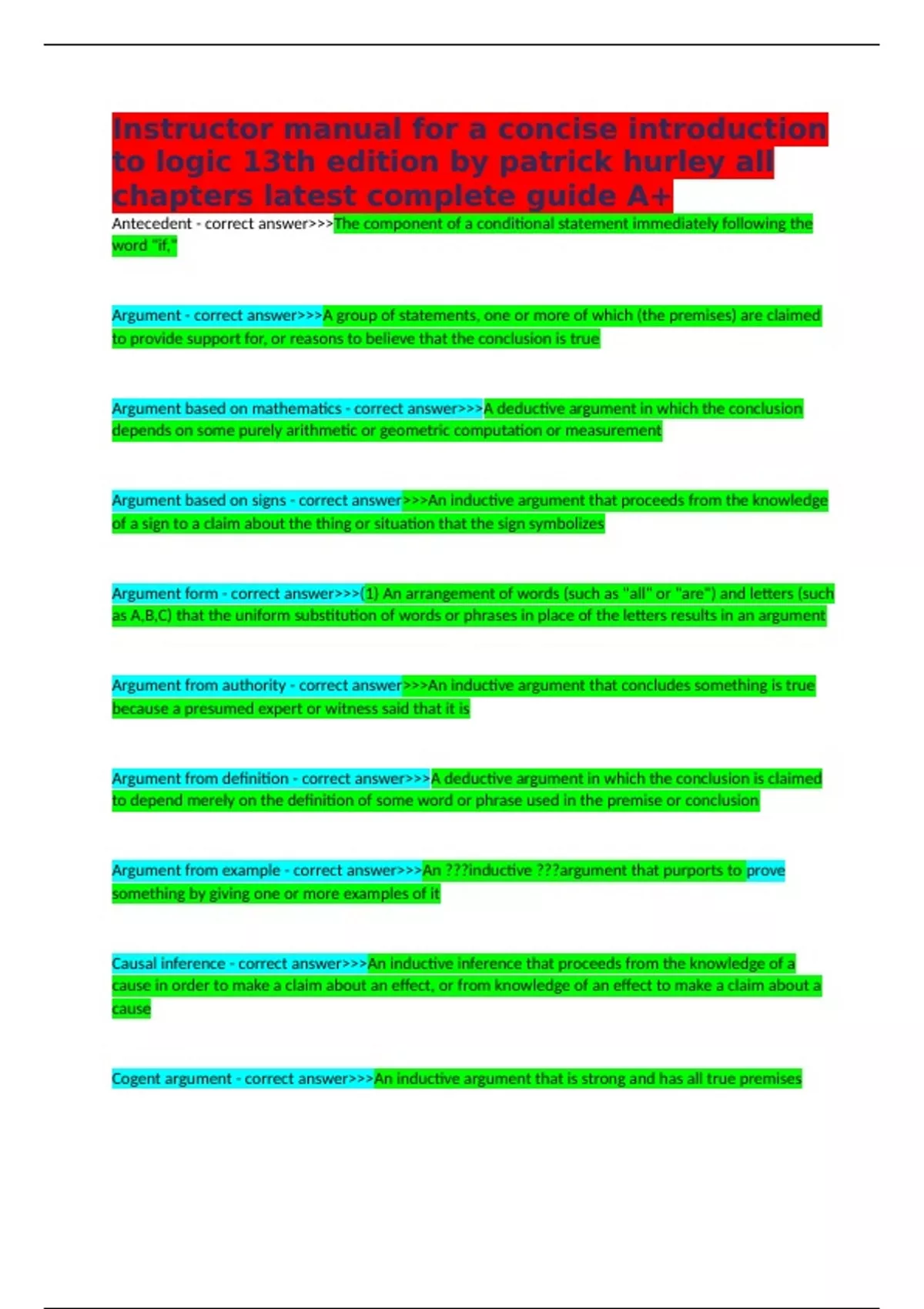 Instructor manual for a concise introduction to logic 13th edition by patrick hurley all chapters latest complete guide A+ Antecedent - correct answer>>>The component of a conditional statement immediately following the word "if," Argument - correct answer>>>A group of statements, one or more of which (the premises) are claimed to provide support for, or reasons to believe that the conclusion is true Argument based on mathematics - correct answer>>>A deductive argument in which the conclusion depends on some purely arithmetic or geometric computation or measurement Argument based on signs - correct answer>>>An inductive argument that proceeds from the knowledge of a sign to a claim about the thing or situation that the sign symbolizes Argument form - correct answer>>>(1) An arrangement of words (such as "all" or "are") and letters (such as A,B,C) that the uniform substitution of words or phrases in place of the letters results in an argument Argument from authority - correct answer>>>An inductive argument that concludes something is true because a presumed expert or witness said that it is Argument from definition - correct answer>>>A deductive argument in which the conclusion is claimed to depend merely on the definition of some word or phrase used in the premise or conclusion Argument from example - correct answer>>>An ???inductive ???argument that purports to prove something by giving one or more examples of it Causal inference - correct answer>>>An inductive inference that proceeds from the knowledge of a cause in order to make a claim about an effect, or from knowledge of an effect to make a claim about a cause Cogent argument - correct answer>>>An inductive argument that is strong and has all true premises Conclusion indicator - correct answer>>>A word that provides a clue to identifying a conclusion. Some examples include: therefore, accordingly, entails that, wherefore, hence, thus, it must be that, it follows that, consequently, so, for this reason, as a result, we may infer