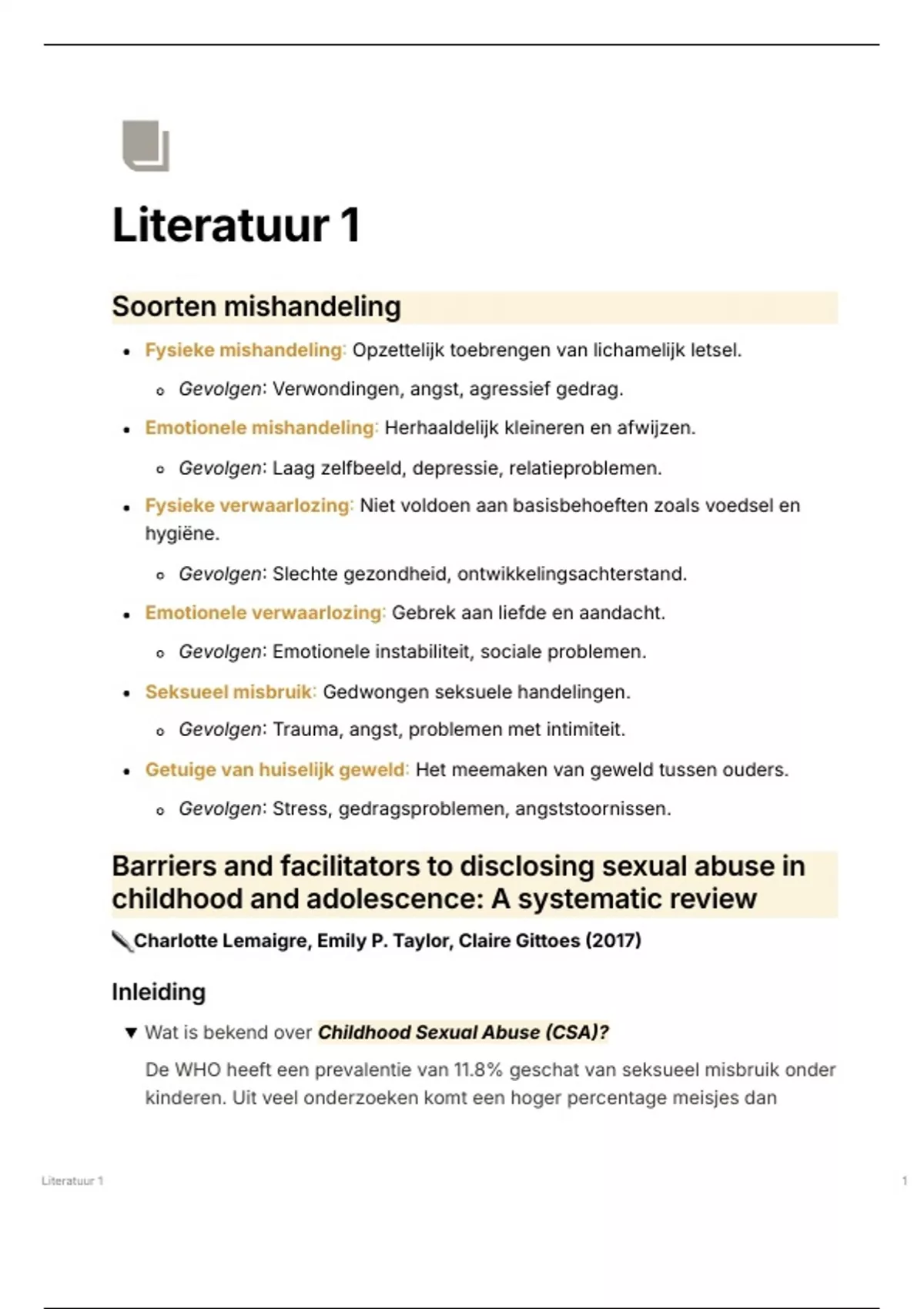 Dit document bevat alle literatuur (artikelen) samengevat voor het vak Forensische Aspecten van Kindermishandeling. Alle artikelen zijn overzichtelijk samengevat en onderverdeeld in inleiding, methode, resultaten en discussie. Hiermee kan jij snel en handig de literatuur tot je nemen!