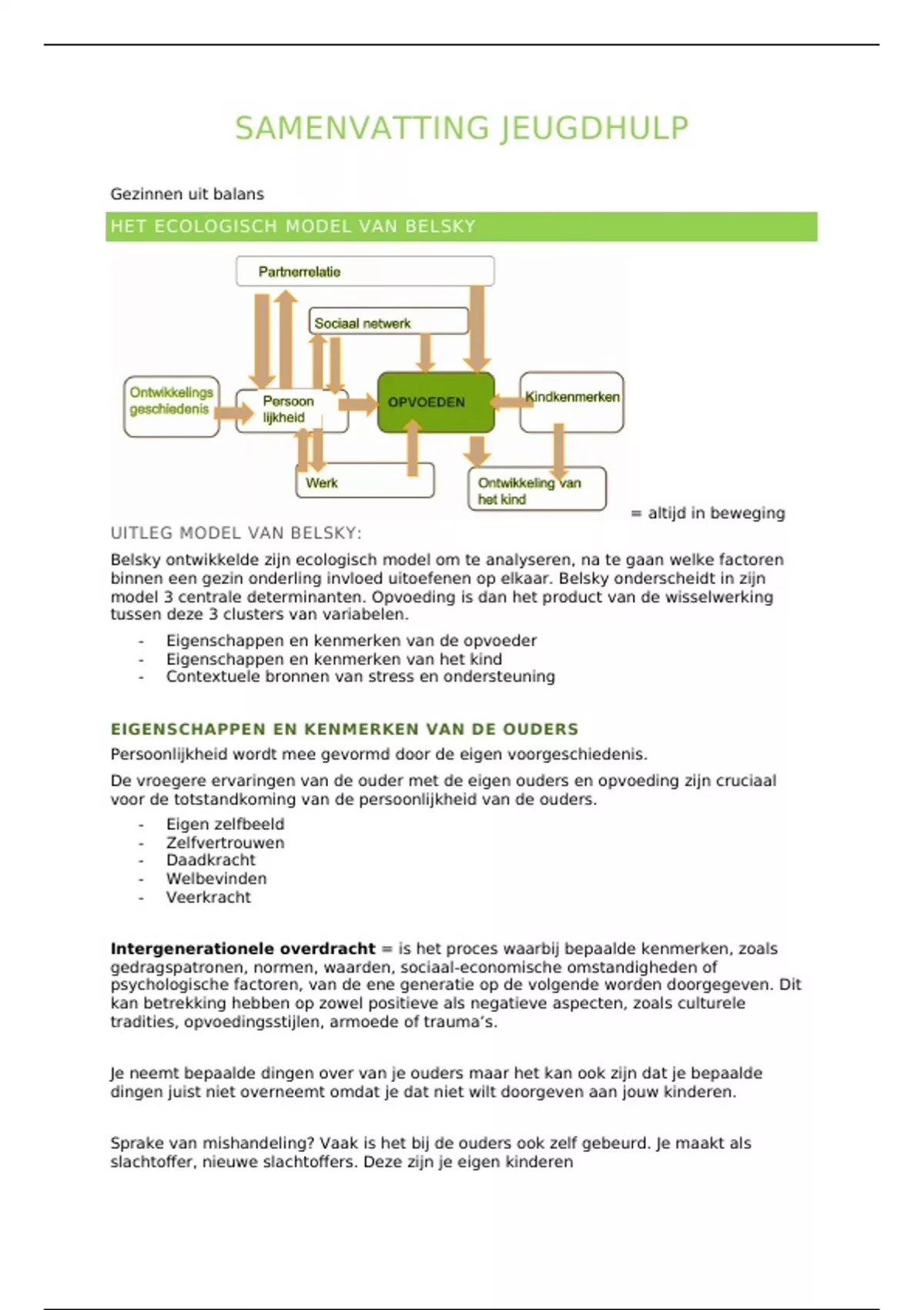 Een duidelijke samenvatting van de belangrijke modellen in jeugdhulp zoals: model van Belsky, Bronfenbrenner, Bakker, Kok en Hellinckx. + duidelijke voorbeelden en oefenvragen die mogelijke examenvragen kunnen zijn.