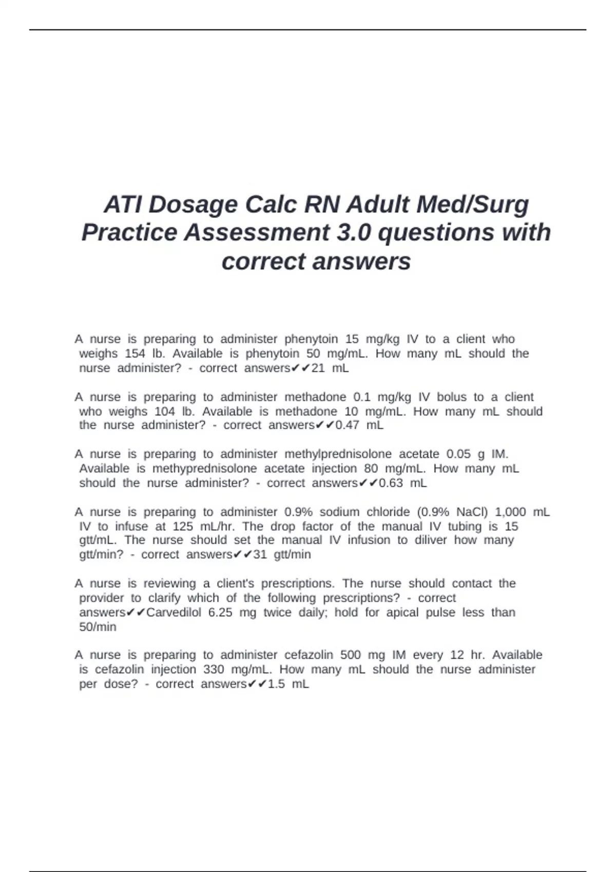 ATI Dosage Calc RN Adult Med/Surg Practice Assessment 3.0 questions with correct answers