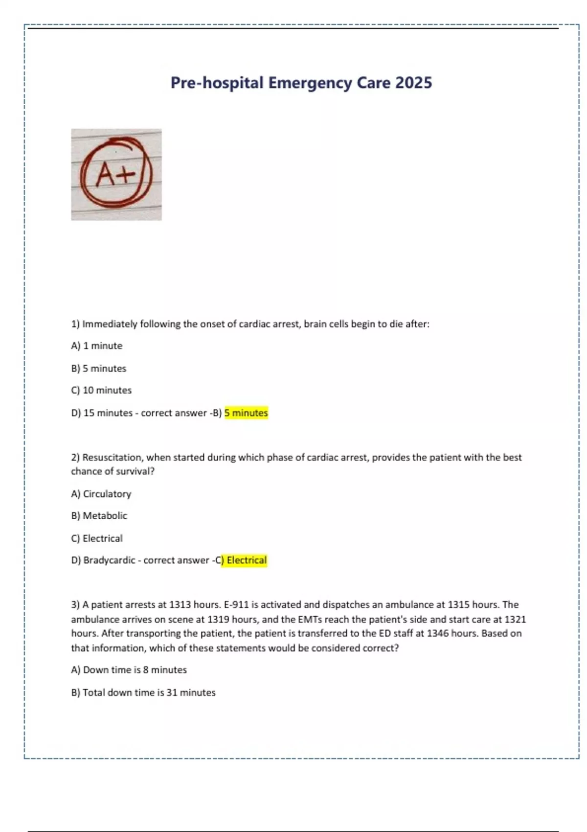 1) Immediately following the onset of cardiac arrest, brain cells begin to die after: A) 1 minute B) 5 minutes C) 10 minutes D) 15 minutes - correct answer -B) 5 minutes 2) Resuscitation, when started during which phase of cardiac arrest, provides the patient with the best chance of survival? A) Circulatory B) Metabolic C) Electrical D) Bradycardic - correct answer -C) Electrical 3) A patient arrests at 1313 hours. E-911 is activated and dispatches an ambulance at 1315 hours. The ambulance arrives on scene at 1319 hours, and the EMTs reach the patient's side and start care at 1321 hours. After transporting the patient, the patient is transferred to the ED staff at 1346 hours. Based on that information, which of these statements would be considered correct? A) Down time is 8 minutes B) Total down time is 31 minutes C) Down time is 25 minutes D) Total down time is 6 minutes - correct answer -A) Down time is 8 minutes