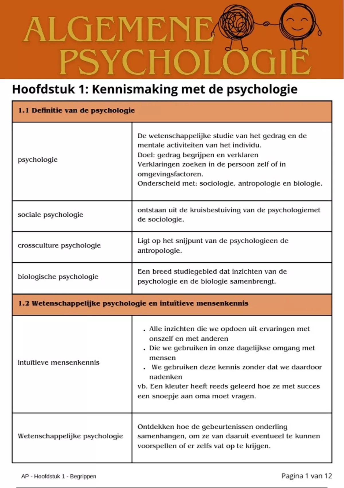 Handig overzicht van de te kennen begrippen van hoofdstuk 1 van Algemene Psychologie