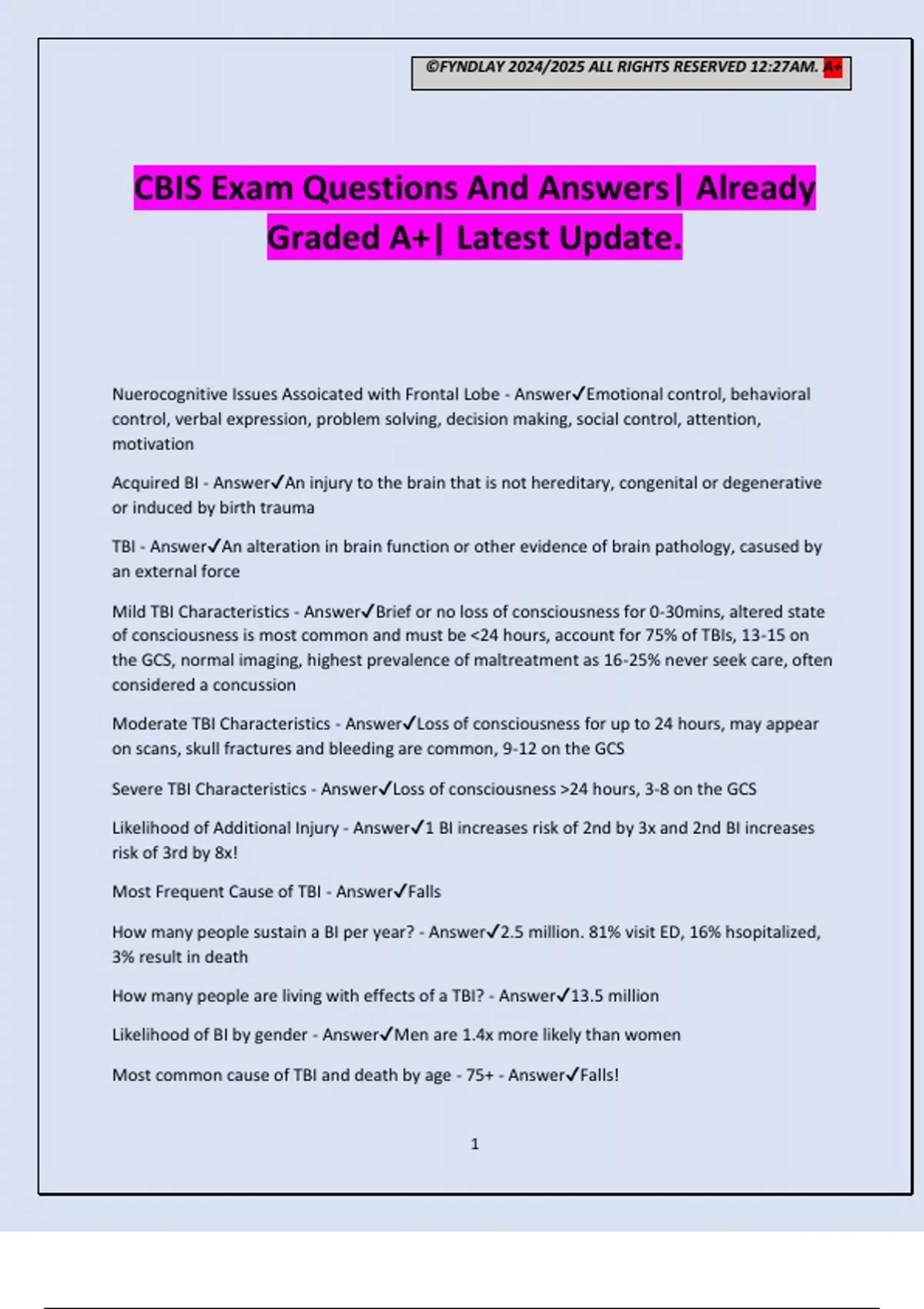 ©FYNDLAY 2024/2025 ALL RIGHTS RESERVED 12:27AM. A+ 1 CBIS Exam Questions And Answers| Already Graded A+| Latest Update. Nuerocognitive Issues Assoicated with Frontal Lobe - AnswerEmotional control, behavioral control, verbal expression, problem solving, decision making, social control, attention, motivation Acquired BI - AnswerAn injury to the brain that is not hereditary, congenital or degenerative or induced by birth trauma TBI - AnswerAn alteration in brain function or other evidence of brain pathology, casused by an external force Mild TBI Characteristics - AnswerBrief or no loss of consciousness for 0-30mins, altered state of consciousness is most common and must be <24 hours, account for 75% of TBIs, 13-15 on the GCS, normal imaging, highest prevalence of maltreatment as 16-25% never seek care, often considered a concussion Moderate TBI Characteristics - AnswerLoss of consciousness for up to 24 hours, may appear on scans, skull fractures and bleeding are common, 9-12 on the GCS Severe TBI Characteristics - AnswerLoss of consciousness >24 hours, 3-8 on the GCS Likelihood of Additional Injury - Answer1 BI increases risk of 2nd by 3x and 2nd BI increases risk of 3rd by 8x! Most Frequent Cause of TBI - AnswerFalls How many people sustain a BI per year? - Answer2.5 million. 81% visit ED, 16% hsopitalized, 3% result in death How many people are living with effects of a TBI? - Answer13.5 million Likelihood of BI by gender - AnswerMen are 1.4x more likely than women Most common cause of TBI and death by age - 75+ - AnswerFalls! ©FYNDLAY 2024/2025 ALL RIGHTS RESERVED 12:27AM. A+ 2 Most common cause of TBI and death by age - 0-3 - AnswerAHT! Most common cause of TBI and death by age - 20-24 - AnswerMVAs and Firearms Most common cause of TBI and death by age - 16-19 - AnswerMVAs! CARF - AnswerAccreditation agency for post acute BI programs, residential, outpatient, vocational, home and community, stroke and pediatric programs - ensures quality of services through requirements for accreditation and surveys Joint Commission - AnswerAccreditation agency for hospital based programs, may accompany CARF accreditation, ensures quality of services through requirements for accreditation and surveys Olmsted Decison - AnswerSupreme court case stimulated by two women living in a nursing home in Georgia for community inclusion - resulted in federal and state initiatives to improve and normalize community living Model Systems of Care 1987 - AnswerResulted in research projects for TBI by the NIDDR, established rehab facilities to provide care and complete clinical research in the process Symptoms of Mild TBI - AnswerHeadache, fatigue, seizures, nausea, numbness, poor sleep, light sensitivity, noise sensitivity, impaired hearing, blurred vision, dizziness, loss of balance, neurological abnormality, in attentiveness, decreased concentration, poor memory, impaired judgment, slow proccessing speed, executive dysfunction, depression, anxiety, agitation, irritability, aggression, impulsivity Primary causes of Mild TBI - AnswerTraumatic intertial - brain moving inside skull Traumatic impact - head hits directly Early Treatment for Mild TBI - AnswerRelaxation techniques, rest, slow return to normal activity, and reduction of normal activity if symptoms recur Peristent Post Concussive Symptoms (PPCS) - AnswerSymptoms of Mild TBI last >1 month, occurs 10% of the time in Mild TBI cases Chronic Traumatic Encephalopathy (CTE) - AnswerOften cause by repeated blows to the head, is a progressive, degenerative condition characterized by broken nuerons which continually release tau protein cashing dementia over time Diffuse axonal injury -> tau protein release -> inflammation of the brain -> progressive dementia ©FYNDLAY 2024/2025 ALL RIGHTS RESERVED 12:27AM. A+ 3 Define Skull - AnswerBony shell that protects the brain, has bony prominences inside which can worsen brain injury Cerebral Spinal Fluid (CSF) - AnswerProvides cushion to nerve tissue, produced by ventricles (4) which also store and circulation CSF through the brain Meninges - AnswerPia Mater - molds around suclhi and gyri, deepest layer Arachnoid Mater - spiderweb-like, middle layer Dura Mater - hard plastic, top layer Nuerons vs Glial Cells - AnswerNuerons communicate electrical impulses throughout brain while Glial cells support and nourish Nuerons Synapse - AnswerA junction between the axon of one neuron and the dendrite of another, allows for passing of communication fro, nueron to neuron Functions of the Parietal Lobe - AnswerSense of touch; differentiation of size, color, and shape; visual perception; spatial perception Functions of the Occipital Lobe - AnswerVisual functions Functions of the Frontal Lobe - AnswerPlanning; organizing; problem solving; working memory; impulse control; decision making; personality; behavior; initiation; anticipation; self- monitoring; motor planning; emotions; awareness of abilities; attention; concentration; mental flexibility; speaking - all executive functions Functions of the Temporal Lobe - AnswerHearing functions, memory, understanding language, organization and sequencing Functions of the Brain Stem - AnswerBreathing, HR, arousal, consciousness, sleep/wake functions, attention, concentration Transmits all sensory information from body to brain and movement signals from the brain to the body Contains sensory centers for hearing