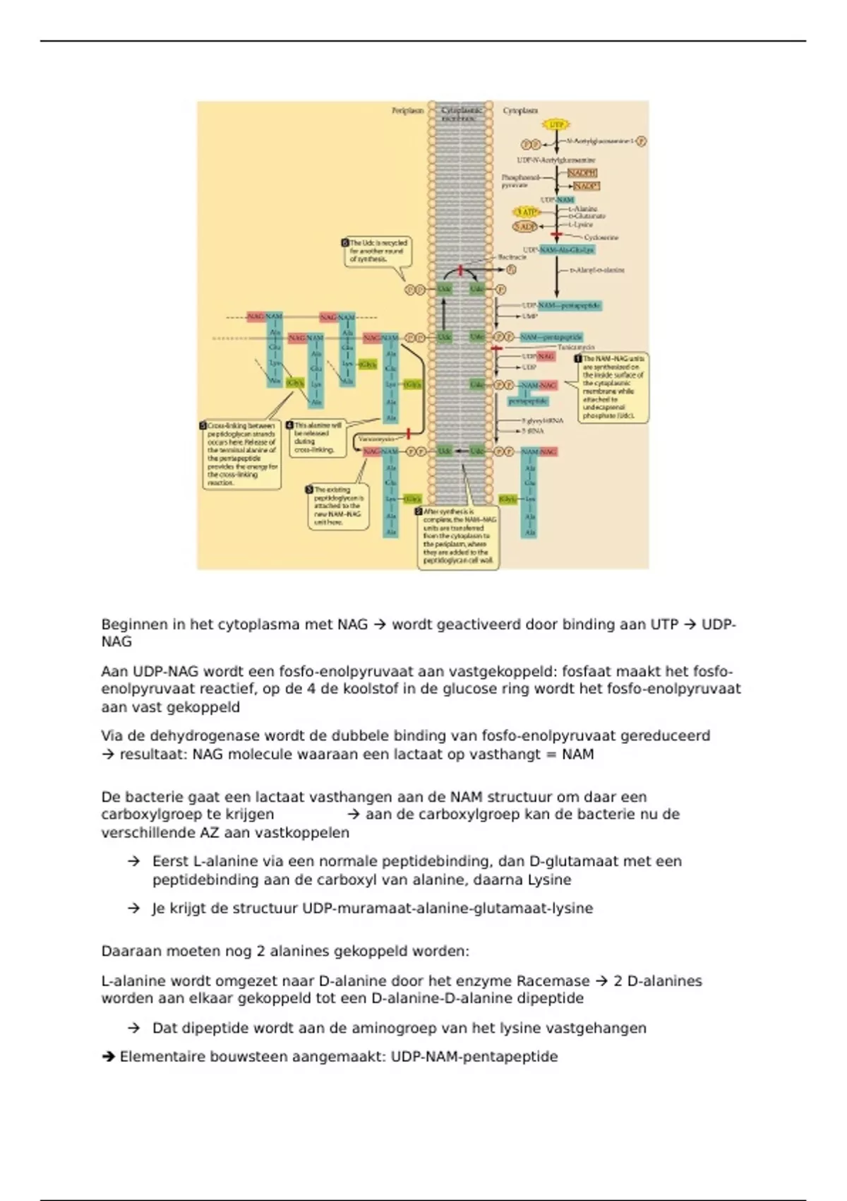 Beginnen in het cytoplasma met NAG wordt geactiveerd door binding aan UTP UDP-