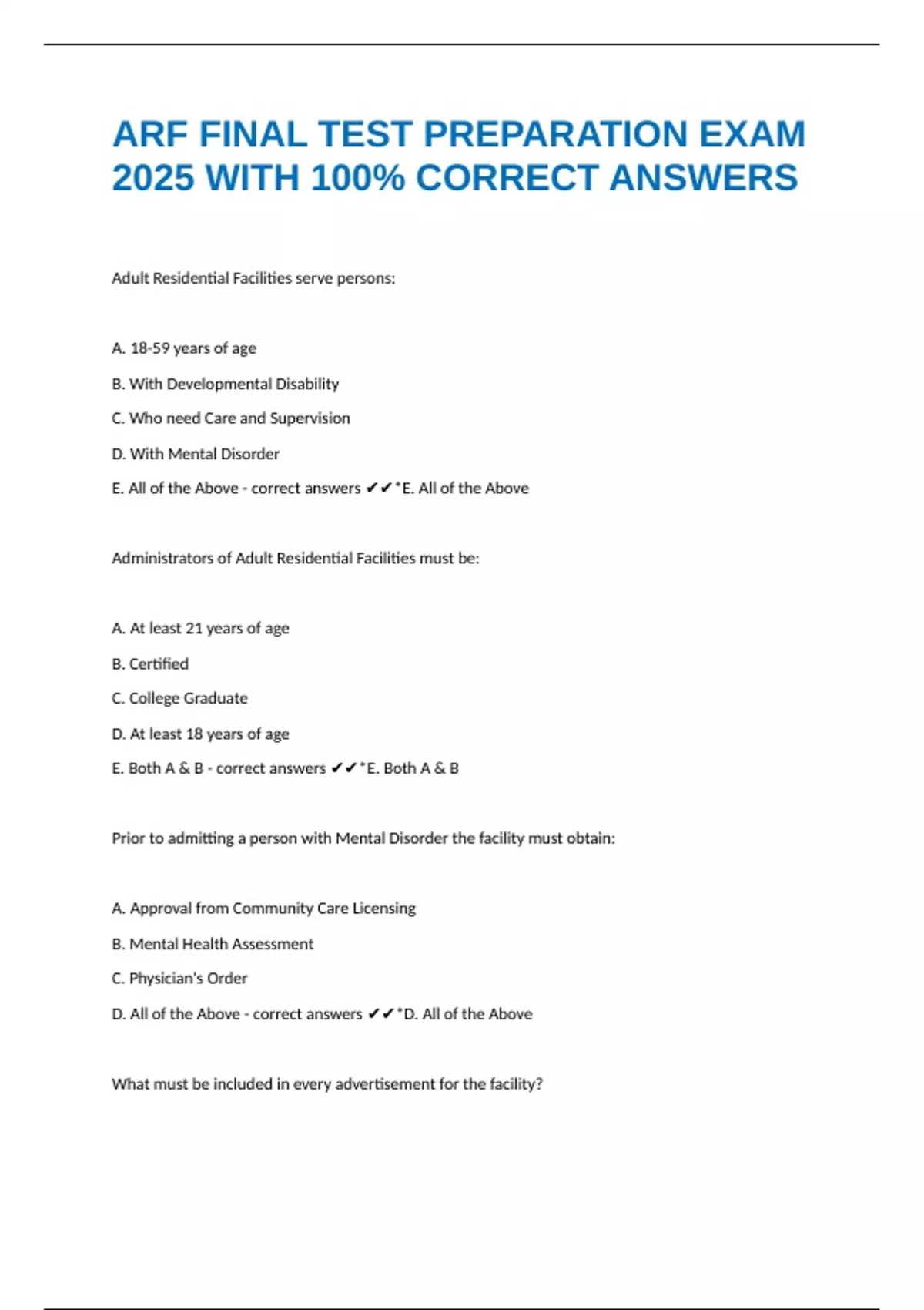 Adult Residential Facilities serve persons: A. 18-59 years of age B. With Developmental Disability C. Who need Care and Supervision D. With Mental Disorder E. All of the Above - correct answers *E. All of the Above Administrators of Adult Residential Facilities must be: A. At least 21 years of age B. Certified C. College Graduate D. At least 18 years of age E. Both A & B - correct answers *E. Both A & B Prior to admitting a person with Mental Disorder the facility must obtain: A. Approval from Community Care Licensing B. Mental Health Assessment C. Physician's Order D. All of the Above - correct answers *D. All of the Above What must be included in every advertisement for the facility?