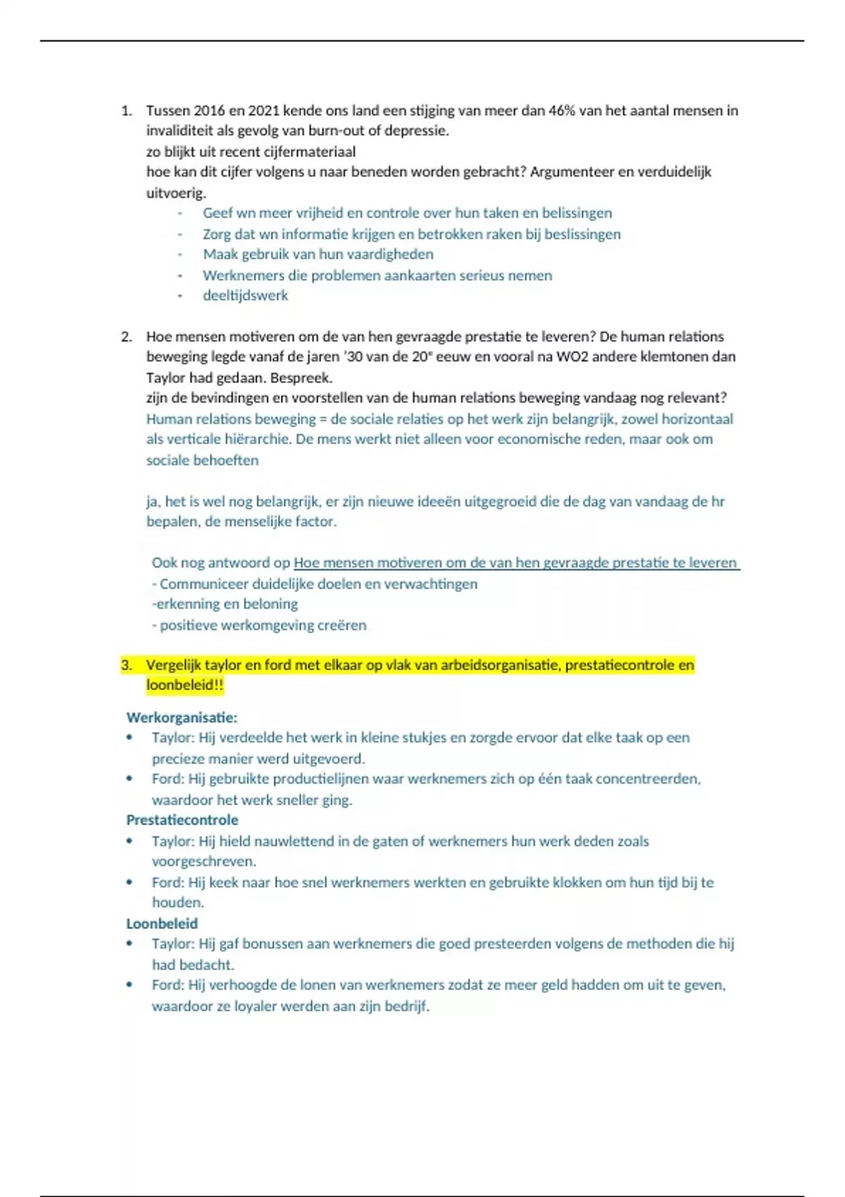 3. Vergelijk taylor en ford met elkaar op vlak van arbeidsorganisatie, prestatiecontrole en