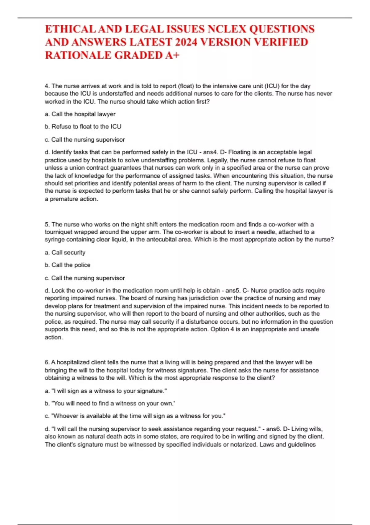 ETHICAL AND LEGAL ISSUES NCLEX QUESTIONS AND ANSWERS LATEST 2024 VERSION VERIFIED