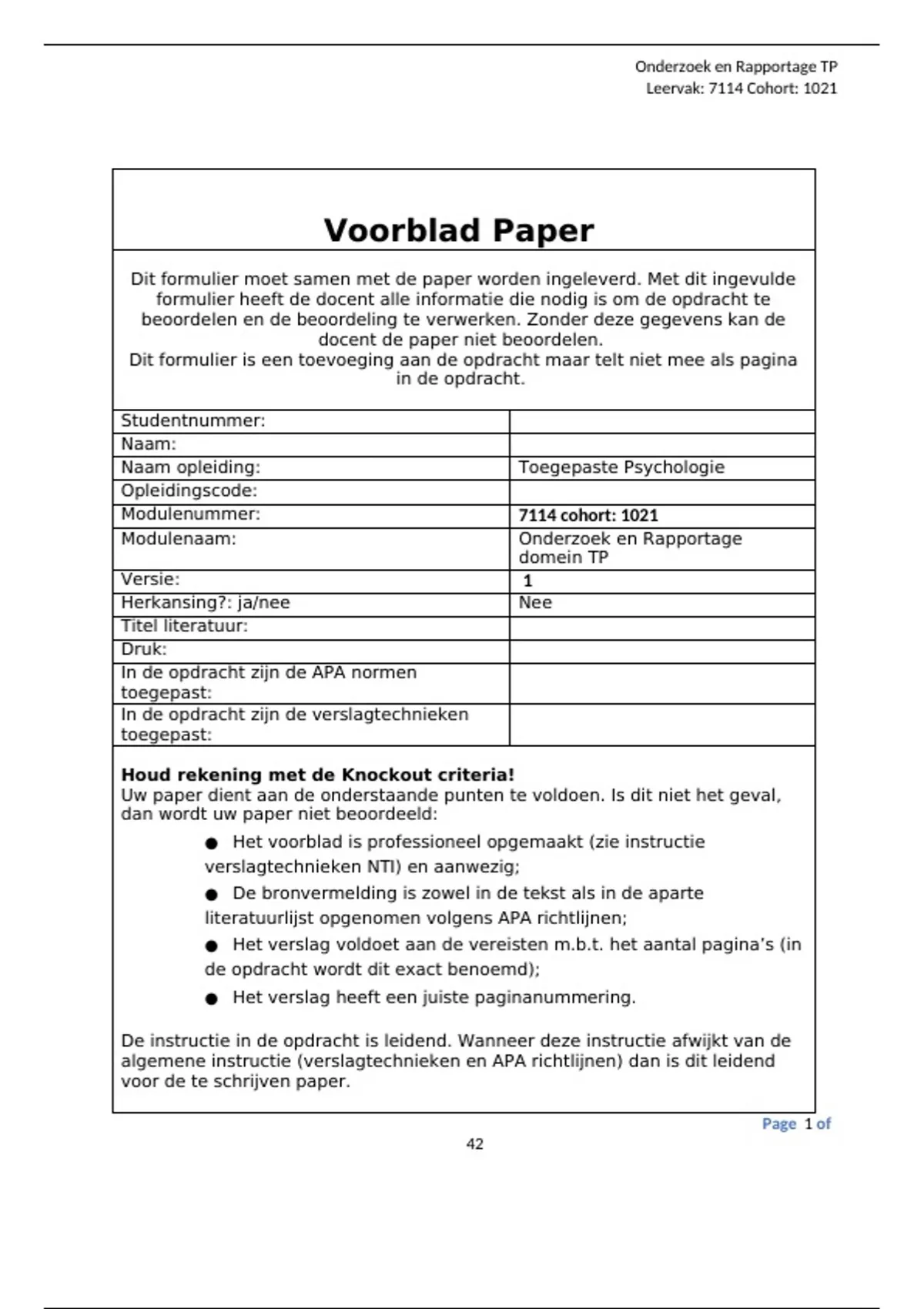 Uw paper dient aan de onderstaande punten te voldoen. Is dit niet het geval,
