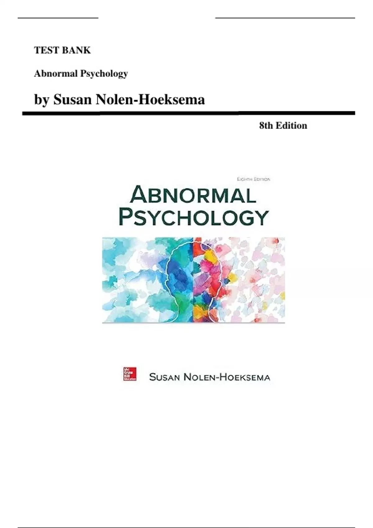 This document offers the full test bank for Abnormal Psychology (8th Edition) by Susan Nolen-Hoeksema. It includes a wide range of multiple-choice, true/false, and case-based questions with correct answers, addressing major psychological disorders, diagnostic criteria (DSM-5), therapeutic approaches, and theoretical models. Ideal for psychology students, educators, and exam preparation focused on mental health and psychopathology.