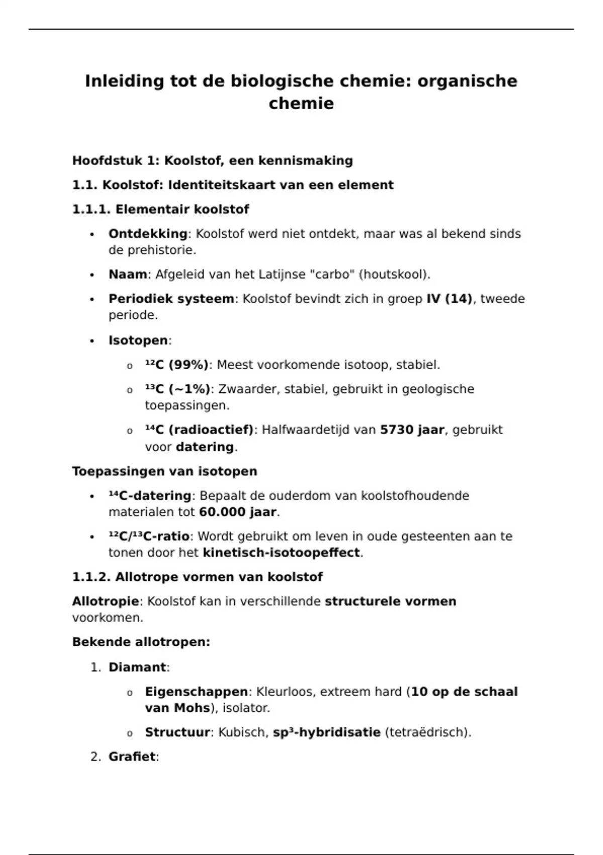 Dit document bevat een overzichtelijke en gestructureerde samenvatting van de leerstof voor het vak Chemie – 2de semester. De focus ligt op organische chemie en haar toepassingen in biologische en fysiologische contexten. Volgende thema’s komen aan bod: Opbouw van organische verbindingen: koolstofstructuren, homologe reeksen en functionele groepen zoals alcoholen, carbonzuren, esters, ketonen en amines Isomerie: structuur- en stereo-isomerie (waaronder cis-trans en enantiomerie met chiraliteit) Chemische reacties: verbrandings-, substitutie-, additie- en eliminatiereacties Polymeren: synthese en eigenschappen van natuurlijke en synthetische polymeren, zoals eiwitten en kunststoffen De samenvatting is opgebouwd met duidelijke kernbegrippen, schematische voorstellingen en puntsgewijze uitleg die helpen om inzicht te krijgen in de samenhang tussen structuur, reactie en biologische functie van organische moleculen.