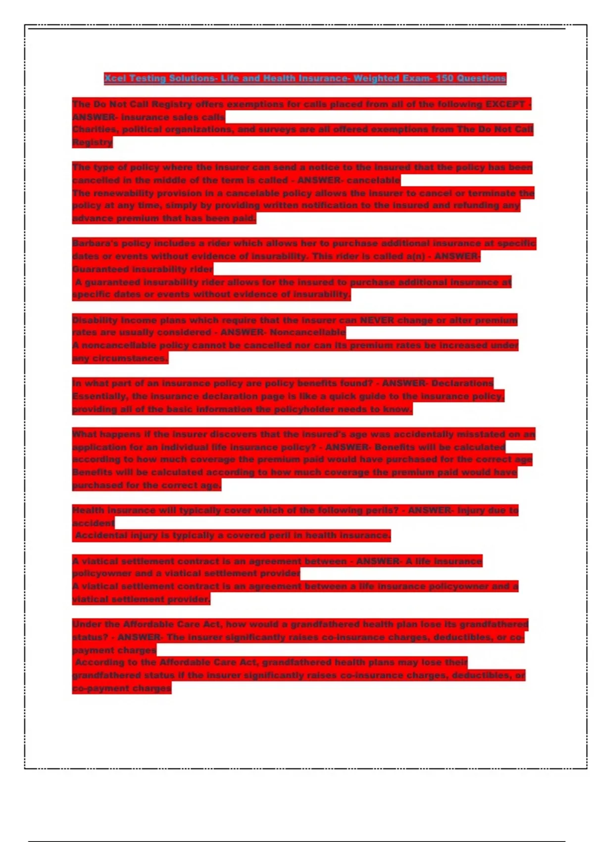 Xcel Testing Solutions- Life and Health Insurance- Weighted Exam- 150 Questions
