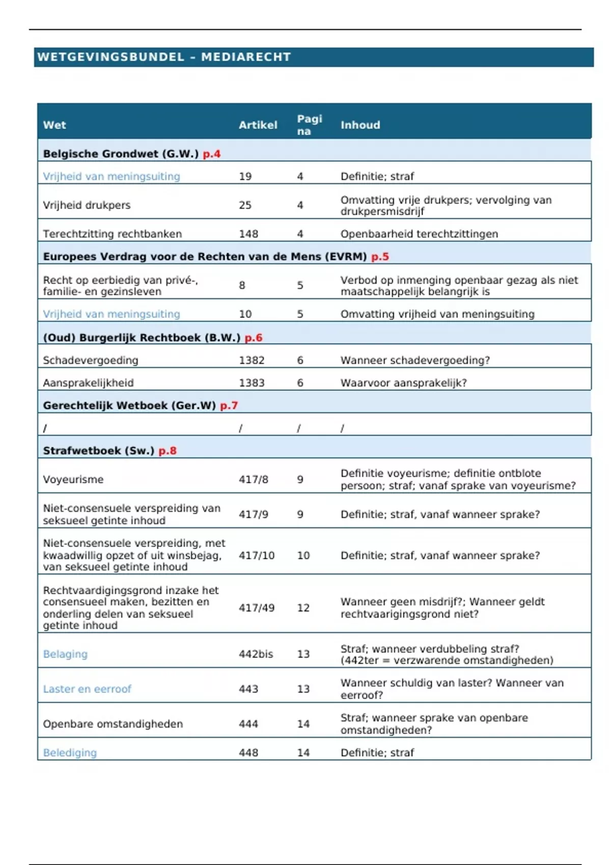 Dit document bevat alle te kennen artikels voor het vak mediarecht. Bij elk artikel staat waar je het kan terug vinden, en wat er in het artikel beschreven staat.