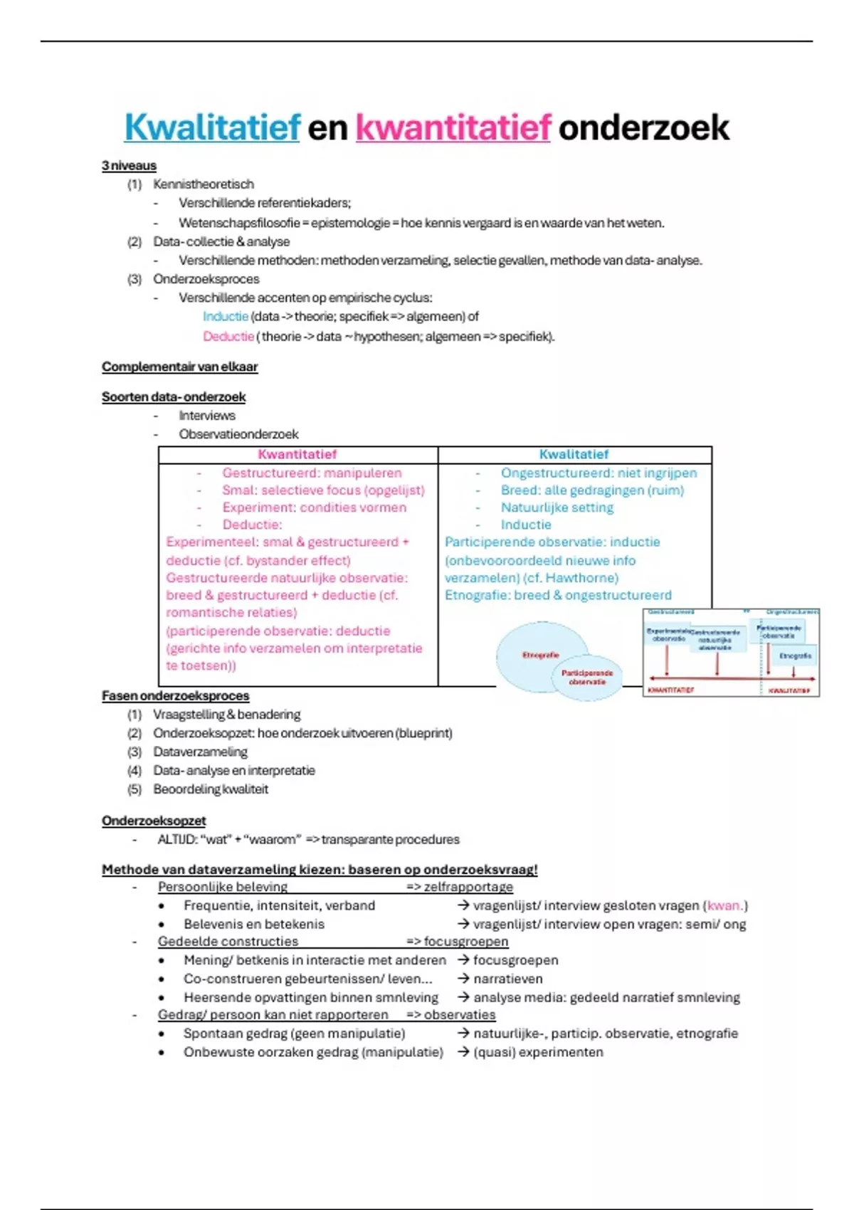 Dit document is gemaakt voor het OPO Methoden van het wetenschappelijk onderzoek, deel 2 in het academiejaar . Dit relatief korte document bevat een iets andere samenvatting van de leerstof dan je elders zal tegenkomen. Je vindt hier niet zozeer de volledige inhoud van alle lessen terug, maar wel een overzichtelijke vergelijking tussen kwalitatief en kwantitatief onderzoek doorheen de hele cursus. Hopelijk helpt deze samenvatting je om wat meer inzicht te krijgen in de leerstof en om die eens op een andere manier te bekijken en te leren. Ik heb dit document onder andere gebruikt om te studeren voor het examen, en ik was er de eerste keer meteen door. Succes!