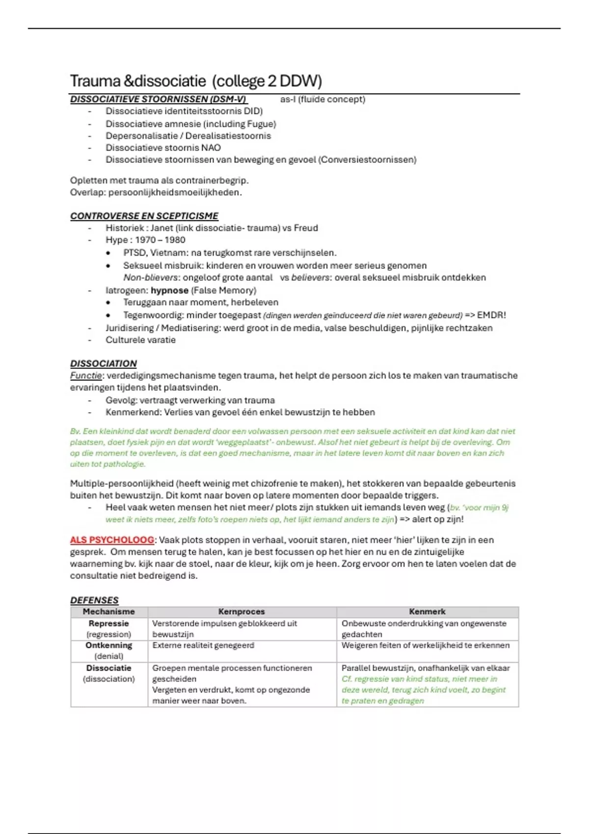 Bij het opstellen ervan streef ik ernaar om de leerstof zo beknopt mogelijk samen te vatten, zonder aan volledigheid in te boeten. Onderwerp les: Trauma en dissociatie Het gehele OPO werd gedoceerd door Claes Stephan, De Wachter Dirk en Vrieze Elske.