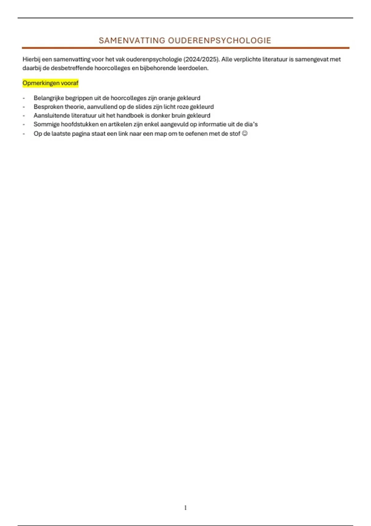 Hierbij een samenvatting voor het vak ouderenpsychologie (2024/2025). Alle verplichte literatuur is samengevat met