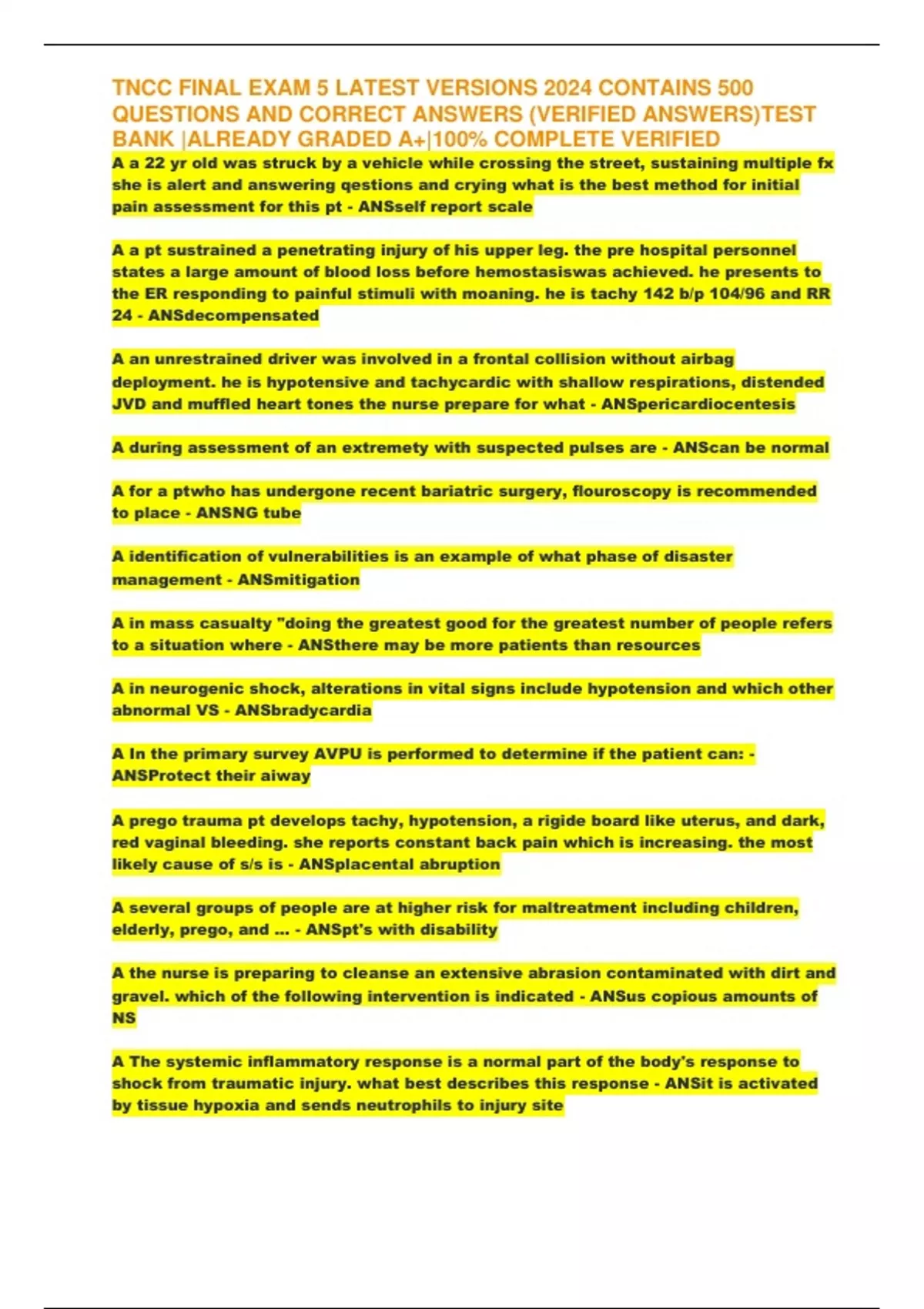 ,TNCC FINAL EXAM 5 LATEST VERSIONS 2024 CONTAINS 500