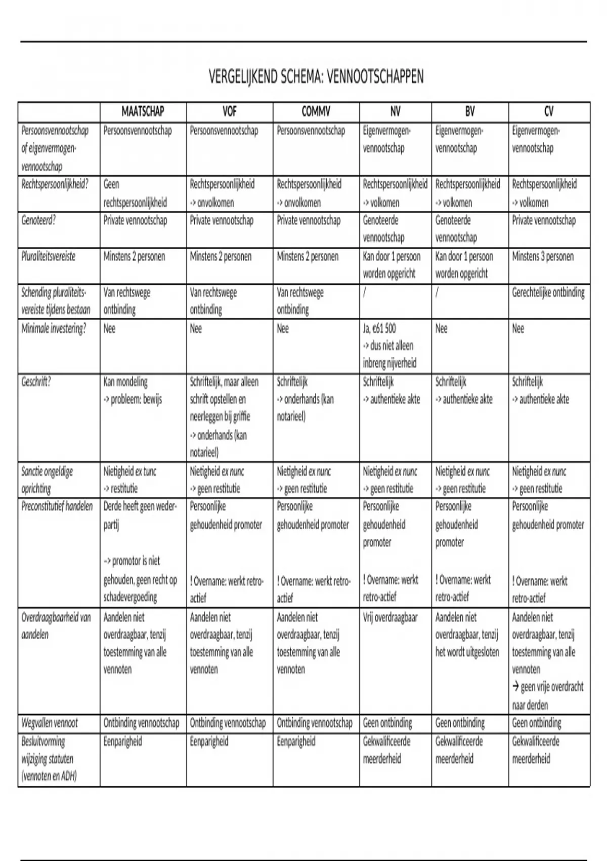 In dit schema geef ik een vergelijking tussen de verschillende vennootschappen. Het schema kan een handige manier zijn om de leerstof op het einde te herhalen, of om mee te beginnen om de basis te studeren.