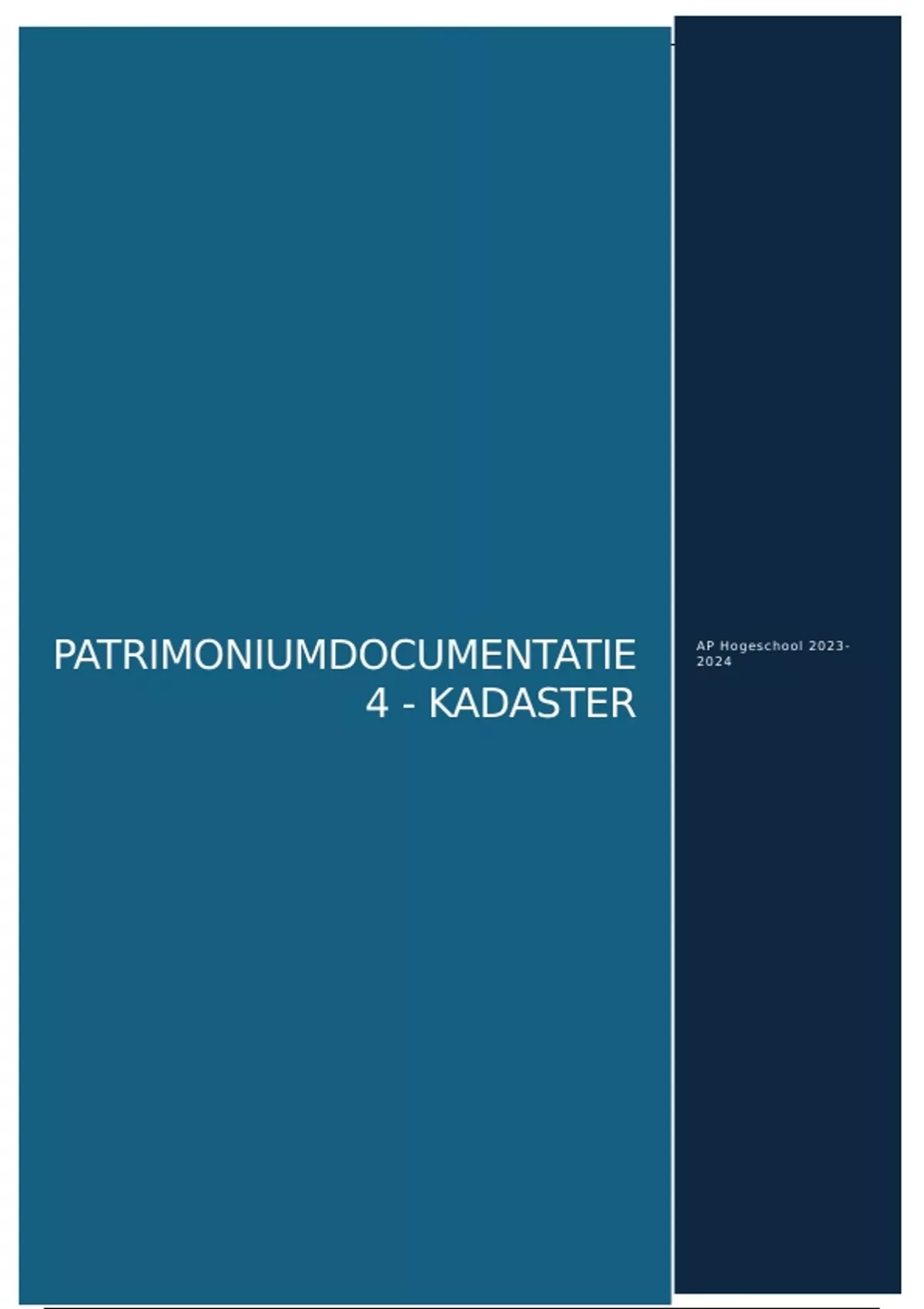 Dit document is een samenvatting van het vak Patrimoniumdocumentatie 2 (deel kadaster), inclusief notities vanuit elke les.