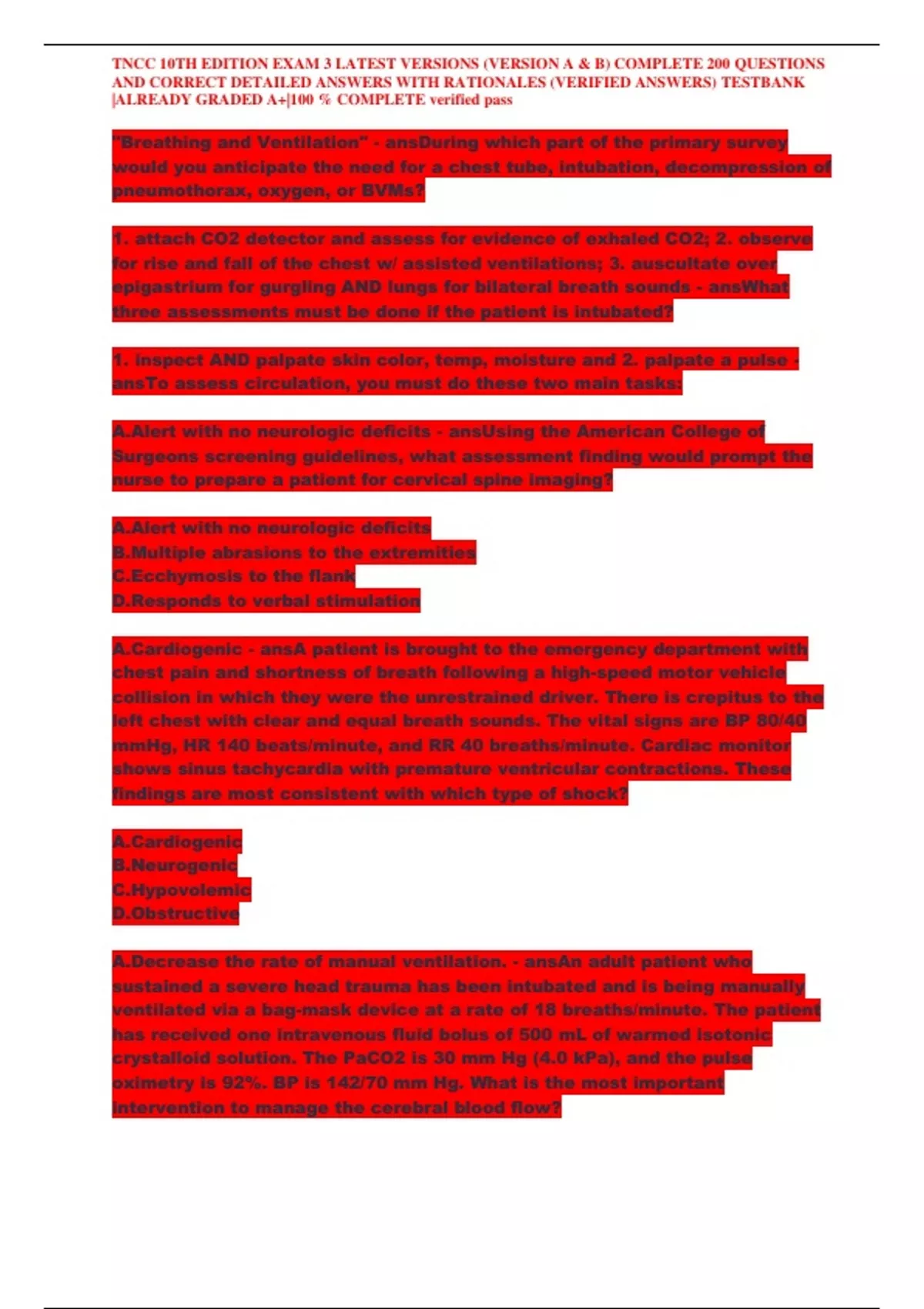 , TNCC 10TH EDITION EXAM 3 LATEST VERSIONS (VERSION A & B) COMPLETE 200 QUESTIONS