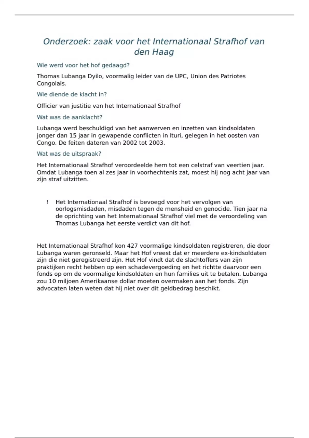Dit is een uitwerking van de onderzoeksopdracht uit hoofdstuk 9, pagina 361. Opdracht: Onderzoek een zaak die aanhangig gemaakt is voor het Internationaal Gerechtshof of het Internationaal Strafhof. ! Ergens in de beschrijving staat er 5de jaar, dit is een fout. Het hoofdstuk hoort bij het leerwerkboek Antropia voor het 6de jaar ! Koop de voordeelbundel van dit volledige hoofdstuk op mijn account! Je vindt er onder andere de volledige samenvatting van het hoofdstuk, uitwerkingen van casussen,... ! Dit document is ook gewoon goed als je op zoek bent naar een zaak in het Internationaal Gerechtshof of het Internationaal Strafhof !