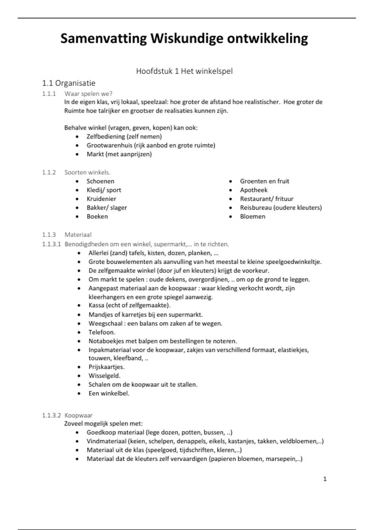 Deze samenvatting behandelt de volledige cursus “Wiskundige ontwikkeling 2.2” van de opleiding aan Odisee Hogeschool. Hoofdstuk 1 focust op het winkelspel en hoe dit kan worden ingezet bij kleuters, inclusief fases van ontwikkeling, materiaalgebruik en spelopbouw. Hoofdstuk 2 behandelt meten en metend rekenen, met aandacht voor grootheden, metriek stelsel, schaalrekenen en meetprocessen. Hoofdstuk 3 behandelt de verschillende vormen van meetkunde zoals topologische, projectieve en euclidische meetkunde en hun toepassing in de kleuterklas. De samenvatting bevat talrijke oefeningen, toepassingen en observatievoorbeelden, en volgt nauwgezet de onderwijsdoelstellingen.