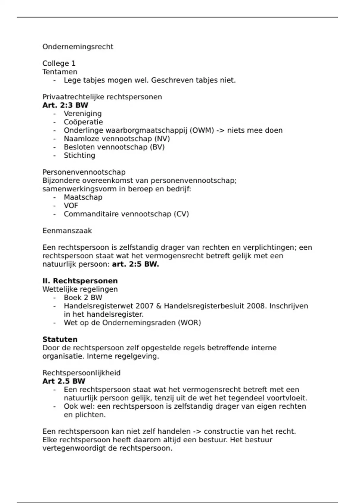 Samenvatting van de colleges van ondernemingsrecht 24/25 van de RUG. Relevante wetsartikelen zijn benoemd.