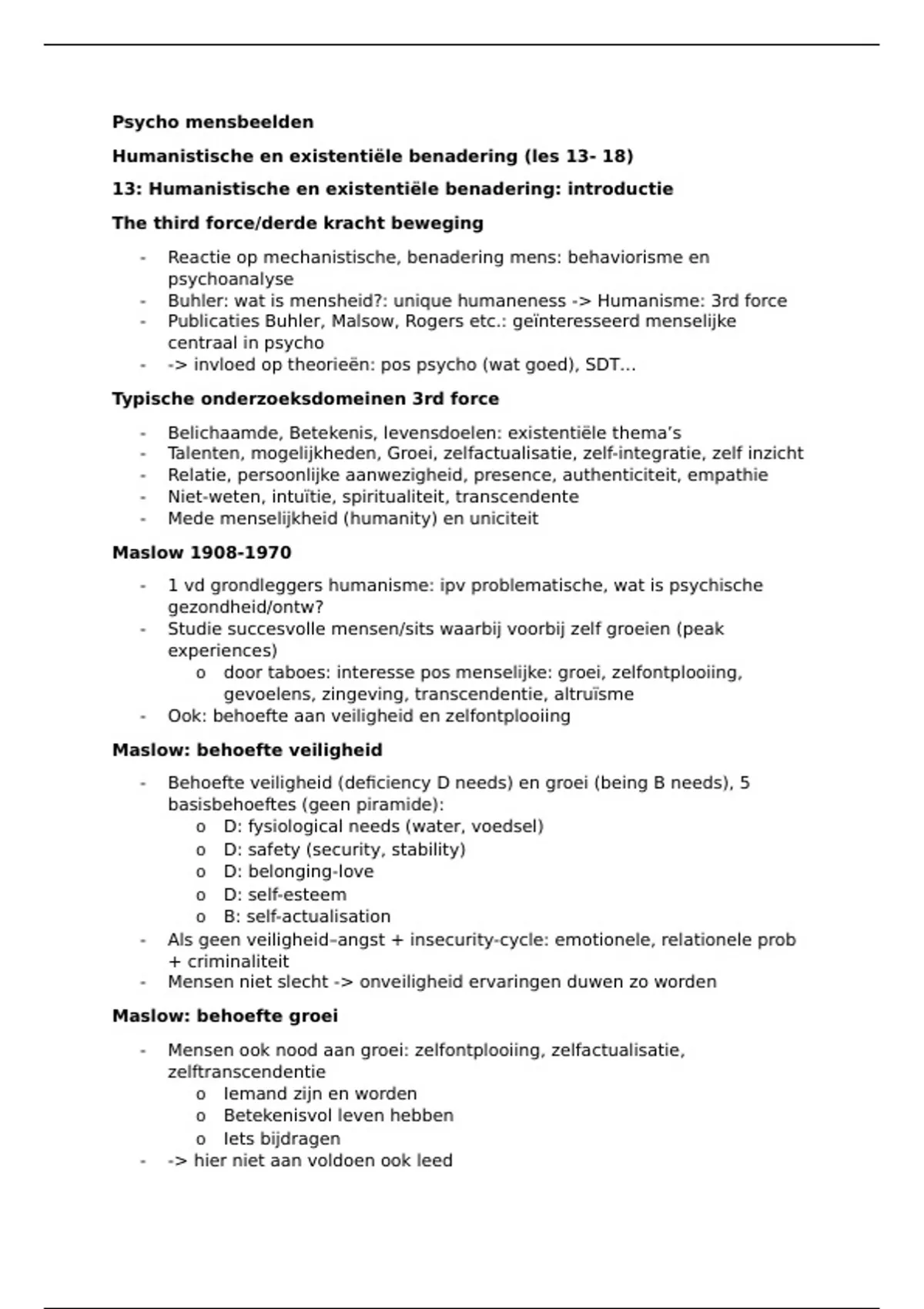 Mensbeelden en Interventies – Humanisme en Existentiële Therapie (Les 13-18),– Samenvatting en voor flashcards!