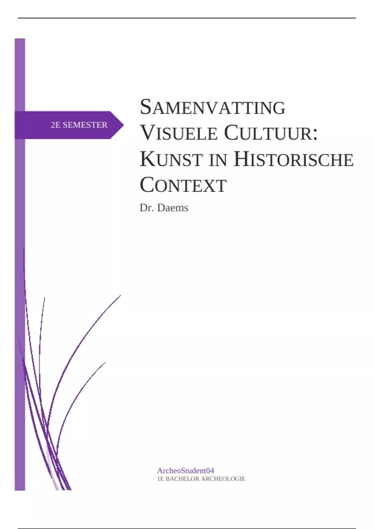 Dit document is een uitgebreide samenvatting van het volledige vak Visuele Cultuur: Kunst in Historische Context. Het is volledig zelfgeschreven, op basis van lesnotities, de powerpoints, en gedeeltelijk het handboek. Er is niet rechtstreeks gekopieerd.